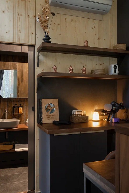 Все для вашего удобства: В вашем распоряжении собственный санузел с душевой кабиной и феном, уютный кухонный уголок с чайной станцией, мини-холодильником и необходимой посудой. Атмосферный пеллетный камин согреет вас прохладными вечерами, а кондиционер подарит приятную прохладу в жаркие дни. Два дополнительных спальных места на мезанине сделают ваше пребывание еще более комфортным.