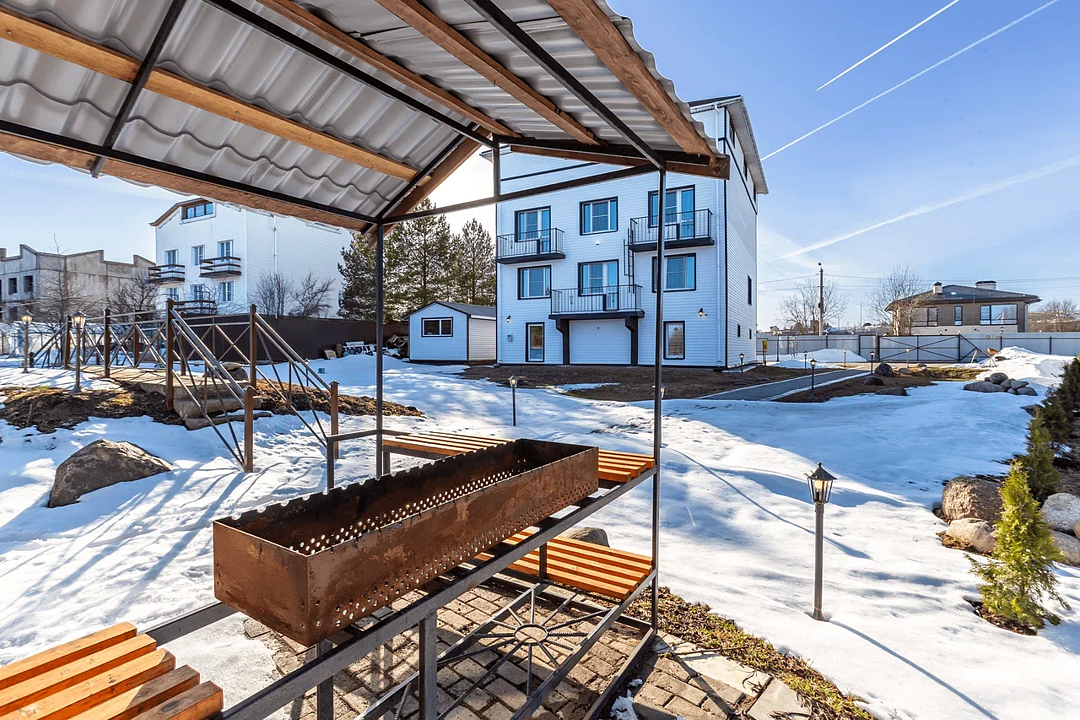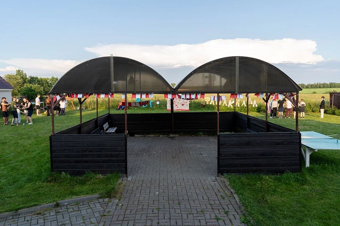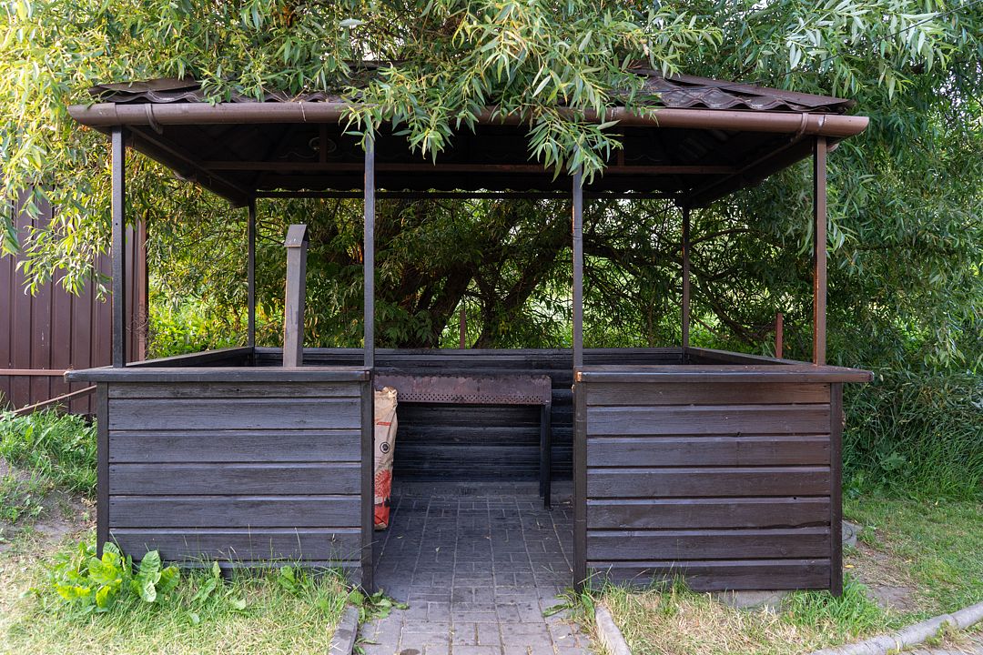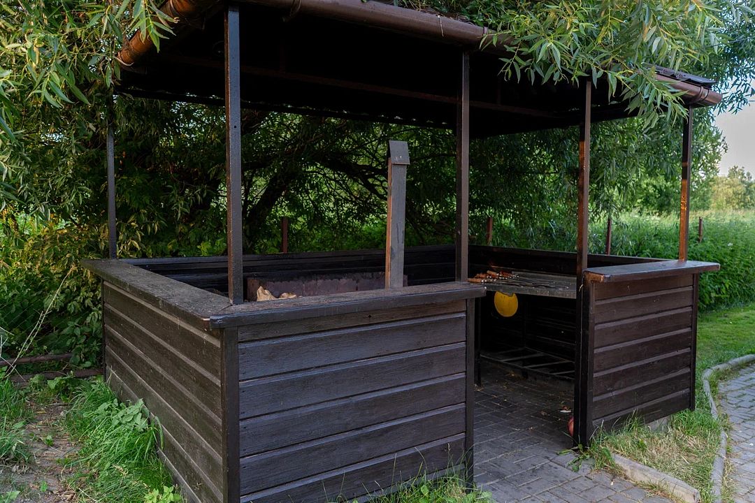 Мангальная зона у коттеджа Мюреля 12. Навес, большой мангал, много шампуров, Решетка — 3 шт. Уголь (2,5 кг) — 2 шт.
