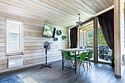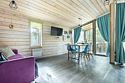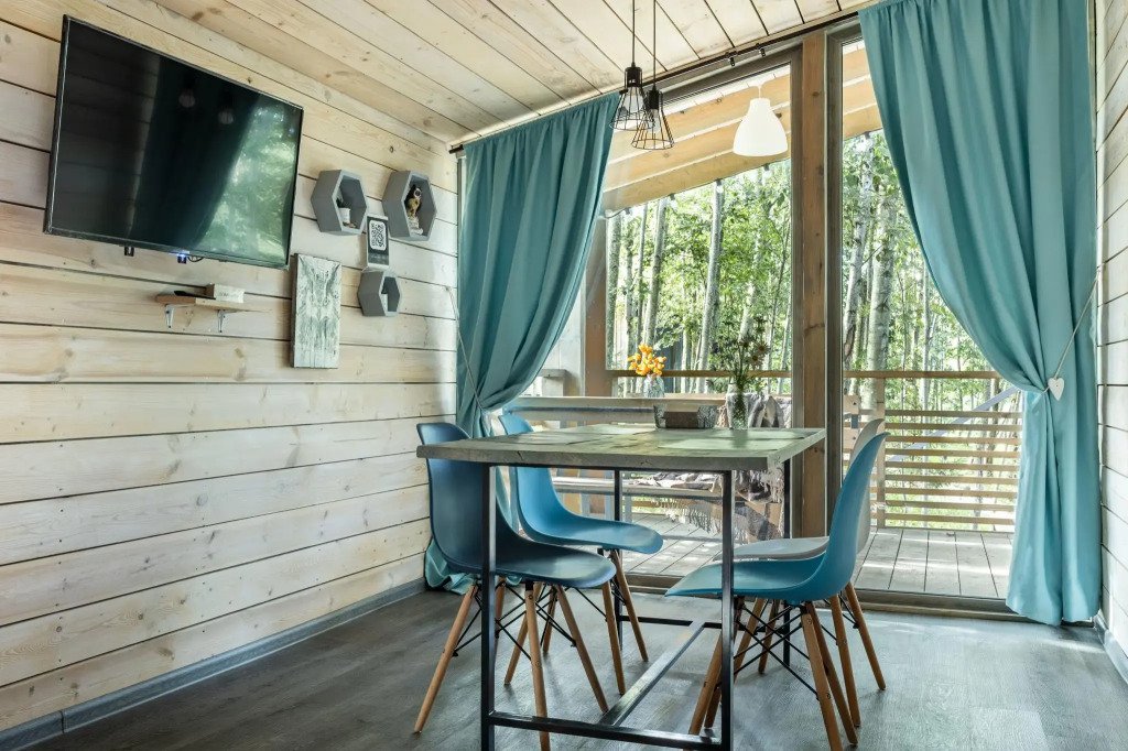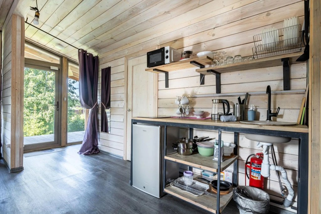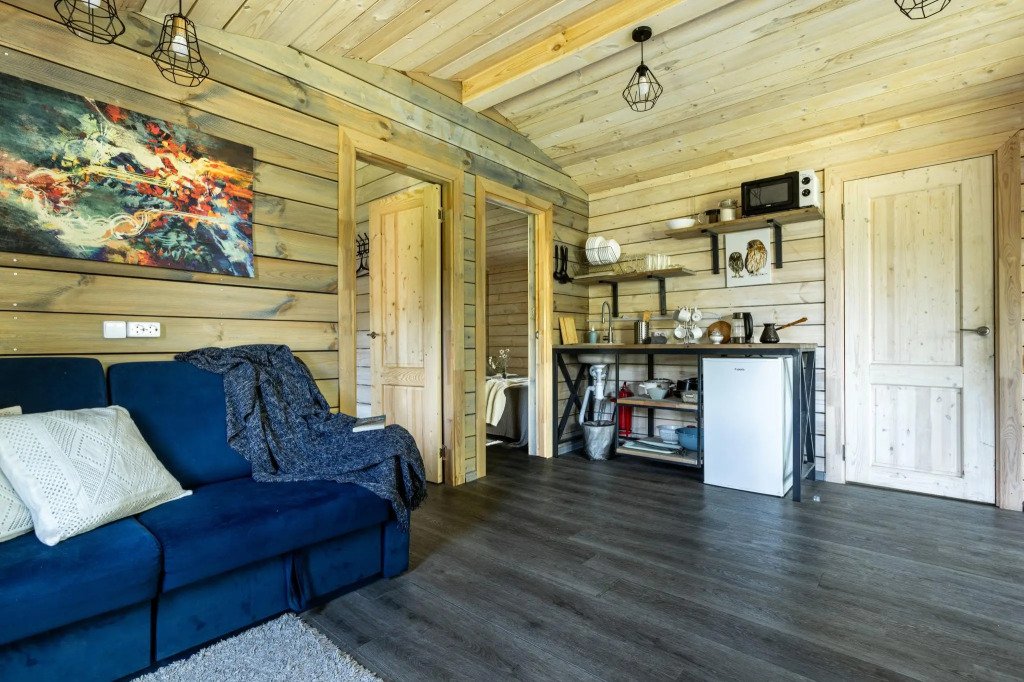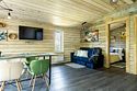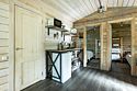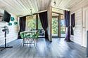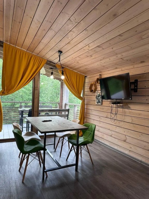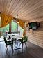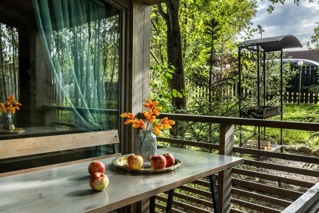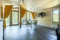 В банном доме есть кухонная зона с кулером, микроволновой печью, чайником и посудой, гостиная зона с панорамными окнами, столом, диваном и телевизором. Совмещенный санузел. Крытая терраса с уличной мебелью.