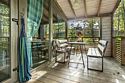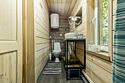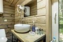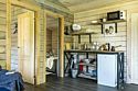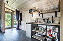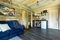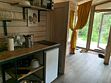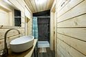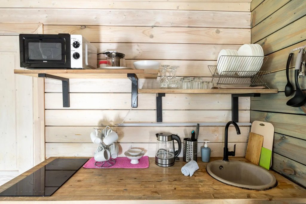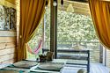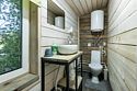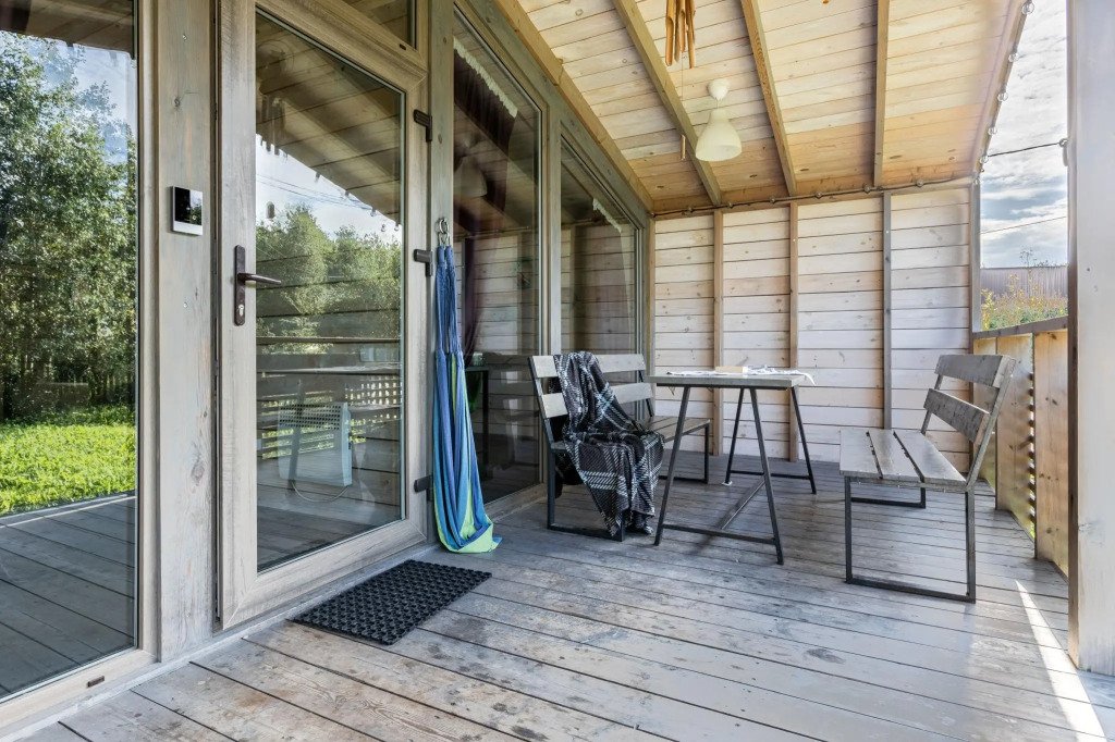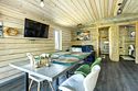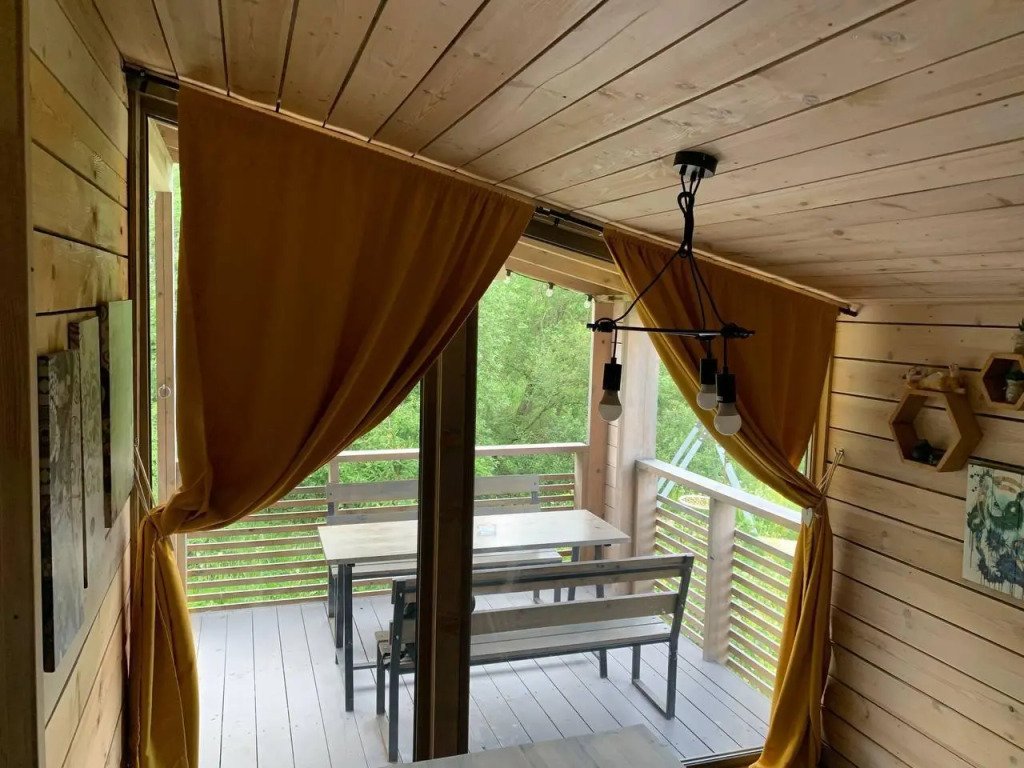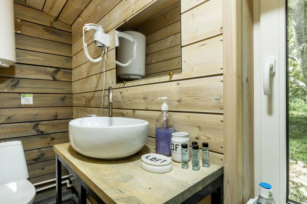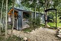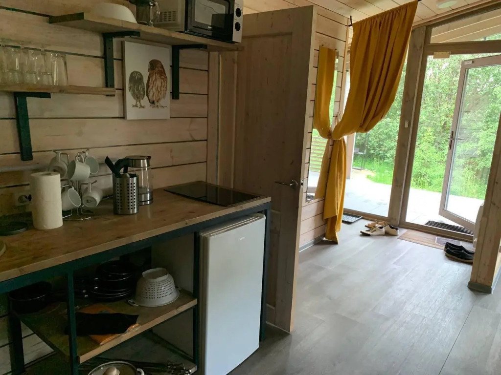 В банном доме есть кухонная зона с кулером, микроволновой печью, чайником и посудой, гостиная зона с панорамными окнами, столом, диваном и телевизором. Совмещенный санузел. Крытая терраса с уличной мебелью.