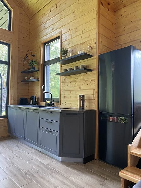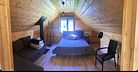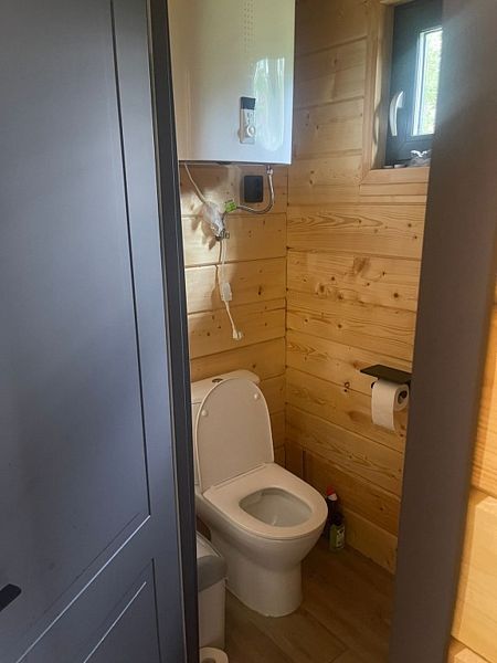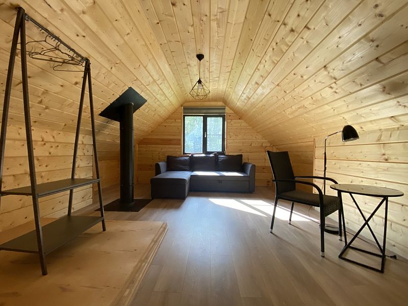 Первый этаж - гостиная-кухня со вторым светом, раскладной диван на 2 спальных места, санузел, душевая, баня. На кухне - плита, посудомойка, чайник, комплект посуды. Второй этаж - двухспальная кровать и раскладной диван.