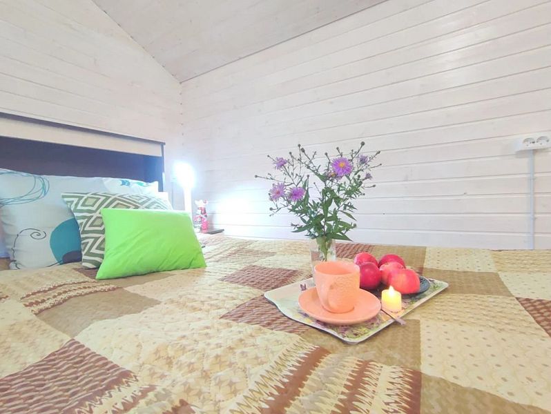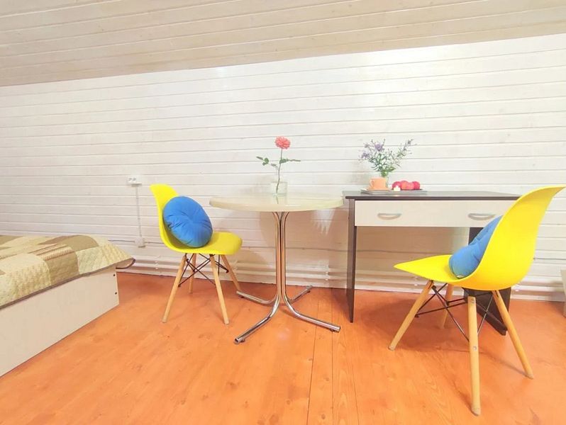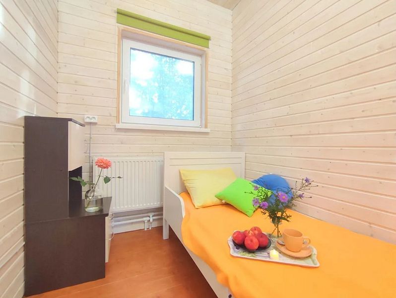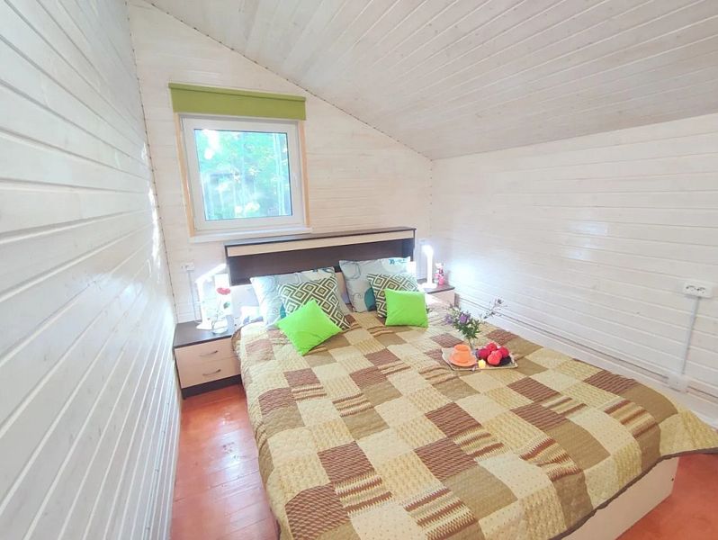 Вторая половина дома (101 кв. м) со своей кухней, санузлом и отдельным входом содержит ОДНУ спальню на втором этаже. На первом этаже – двуспальный раскладной диван-книжка и две односпальные кровати, на втором этаже – двуспальная кровать.