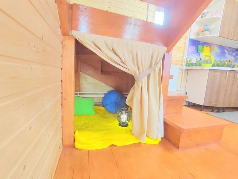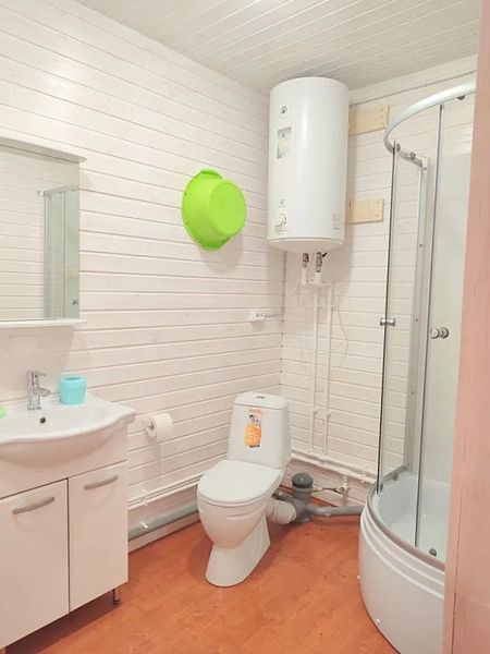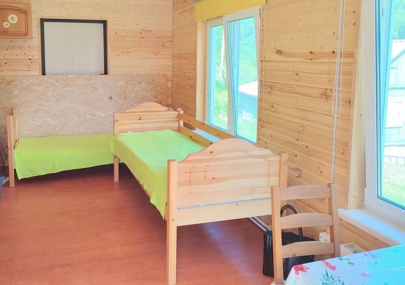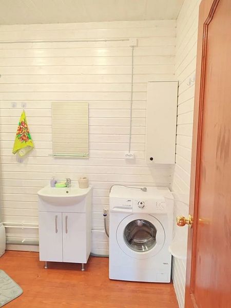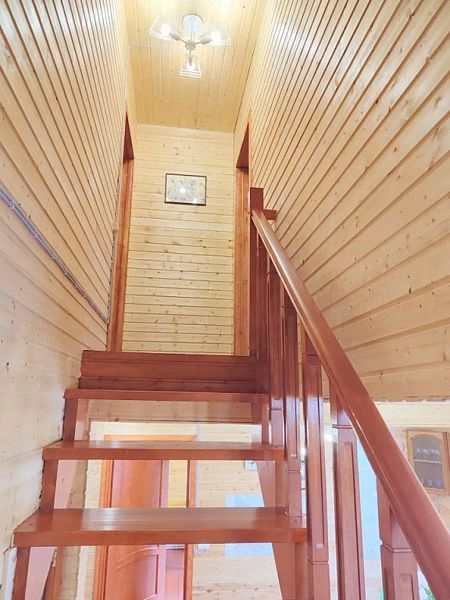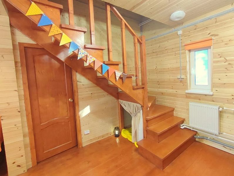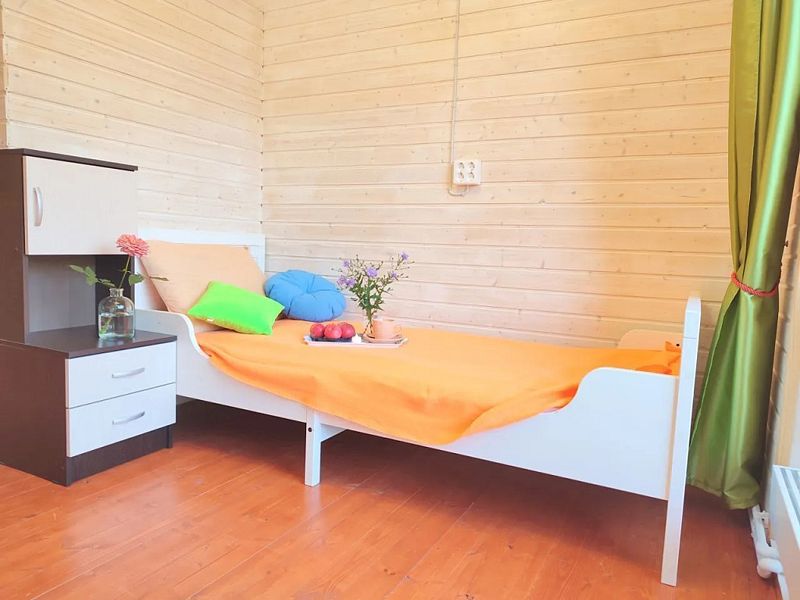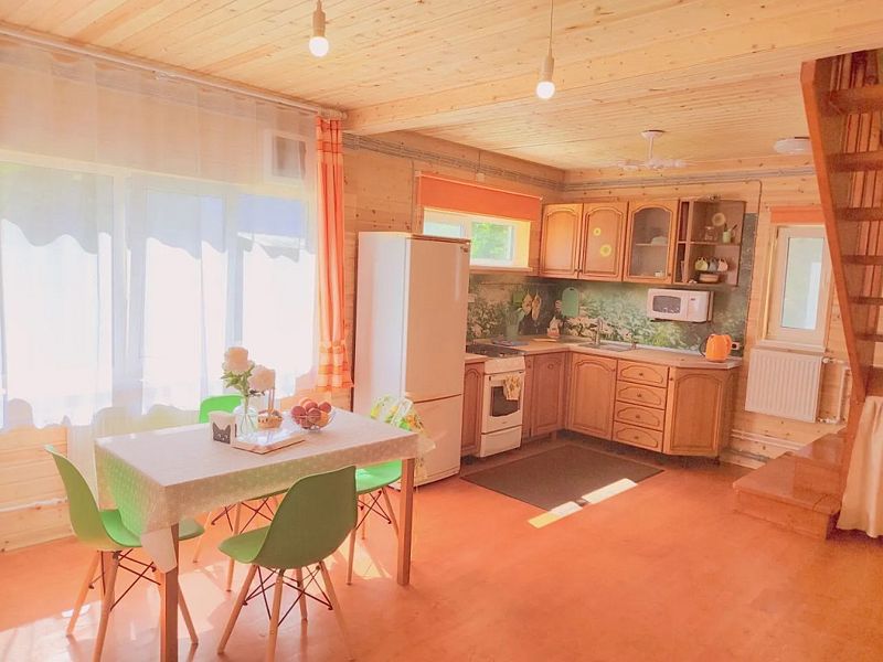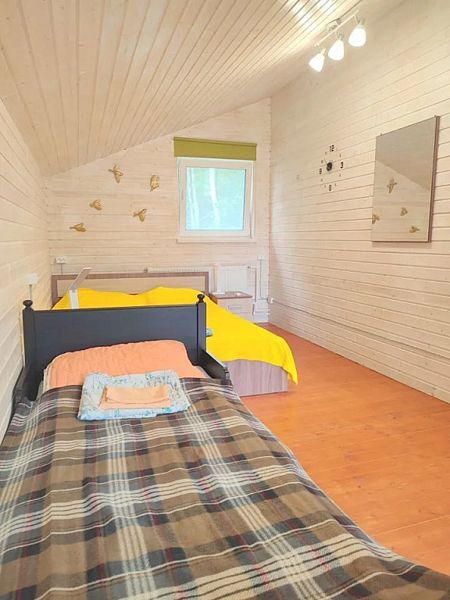 Первая половина дома (110 кв. м) со своей кухней, санузлом и отдельным входом содержит ДВЕ спальни на втором этаже. На первом этаже – двуспальный раскладной диван-книжка, на втором этаже в одной комнате - двуспальная кровать, в другой комнате - две односпальные кровати.