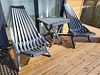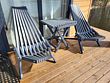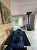 На террасе уличная мебель, закрытое гриль-барбекю, для приготовления блюд на огне.