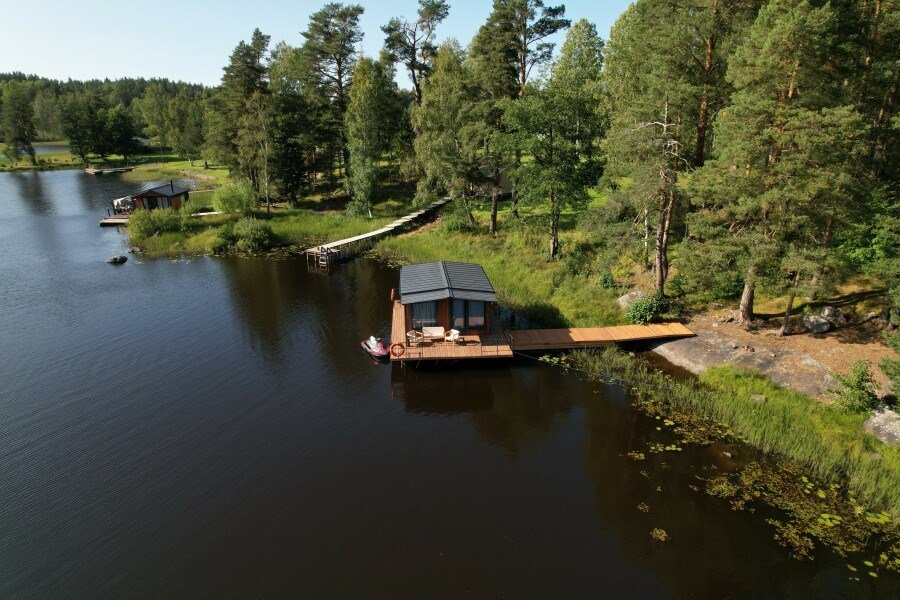 Плавучие домики оборудованы всем необходимым для комфортного проживания и отдыха. Каждый домик расположен на отдельном участке водоема, обеспечивая максимальный уровень приватности и комфорта. У вас будет собственный пирс с выходом на скалистый живописный берег реки.