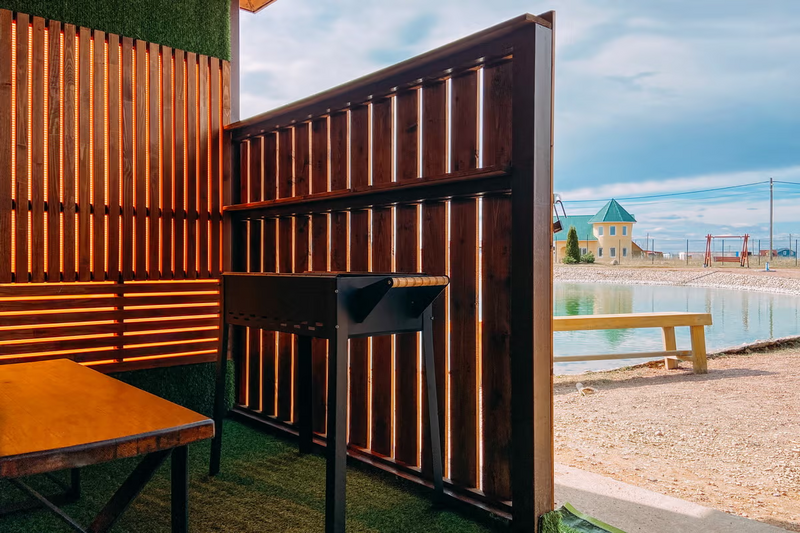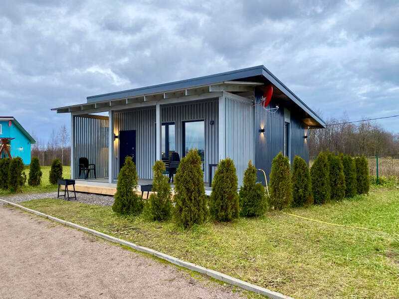 Коттедж общей площадью 25 м2 имеет просторную кухню-гостиную. Одна спальня с двуспальной кроватью. В гостиной расположен диван. Стильная душевая и сан. узел. Мангал решетка и шампура входят в стоимость.
