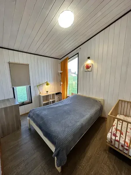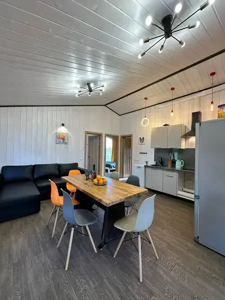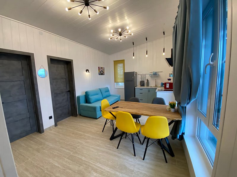 Кухня-гостиная, оснащенная всей техникой и посудой (тв, посудомойка, холодильник, варочная панель, микроволновая печь). 1 отдельная спальня с двуспальной кроватью 160/200, детская кроватка предоставляется бесплатно. Кухня-Гостиная двуспальный диван. Бесплатный Wi-Fi. Туалет и просторная душевая с теплыми полами. Большая крытая терраса с подвесным креслом. Мангальная зона, мангал, решетка и шампура предоставляется бесплатно. Возможно проживание с домашними питомцами.