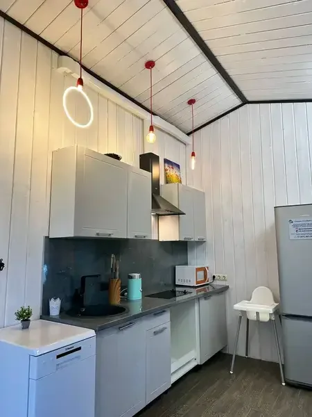 Во всем коттедже теплые полы. Кухня оборудована всей необходимой техникой: микроволновая печь, холодильник, посудомоечная машина, умная колонка Алиса.