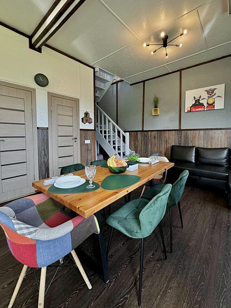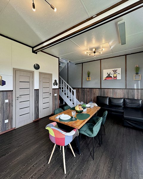 Коттедж общей площадью 110 м2 имеет просторную кухню-гостиную. Три спальни с двуспальными кроватями, детская кроватка предоставляется бесплатно (1 спальня на первом, 2 на втором этаже). В гостиной расположен двуспальный диван. Кухня оборудована всей необходимой техникой: варочная панель, микроволновая печь, холодильник, посудомоечная машина, спутниковое TV. Мангал решетка и шампура входят в стоимость. 2 туалета и просторная душевая. Парная на дровах. Бесплатный Wi-Fi