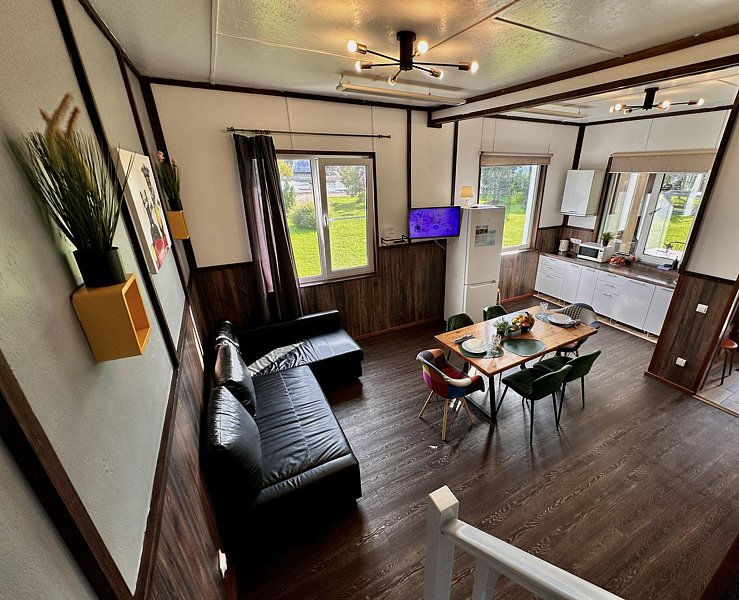 Коттедж общей площадью 39 м2 имеет просторную кухню-гостиную с камином. Одна спальня с двуспальной кроватью. В гостиной расположен двуспальный диван. Мангал решетка и шампура входят в стоимость. Комфортный сан. узел и душевая с теплым полом. Бесплатный WI-FI.