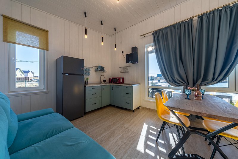 Крытая терраса с подвесным креслом. Безлимитный WI-Fi. Кухня-гостиная оснащена всей техникой и посудой (тв, посудомойка, холодильник, варочная панель, микроволновая печь). 2 отдельные спальни с двуспальной кроватью 160/200, детская кроватка предоставляется бесплатно. В кухне-гостиной — раскладной диван. Туалет и душ, во всем коттедже теплые полы. Большая крытая терраса с подвесным креслом. Мангальная зона, мангал, решетка и шампура предоставляется бесплатно. Возможно проживание с домашними питомцами.