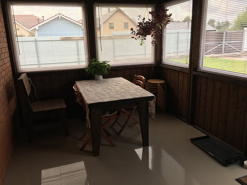 В доме: кухня-гостиная с диваном и телевизором. Три отдельные спальни, два санузла. Закрытая веранда (шампура и финская сковородка). Спальные места: три 2-х спальные кровати, диван 2х-х спальный, диван 3х спальный, есть раскладушка Икеа ( удобная). Кухня оборудована всей необходимой посудой и техникой.