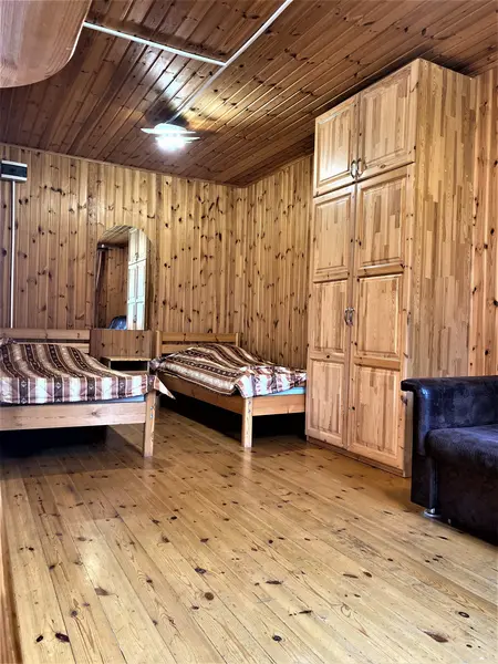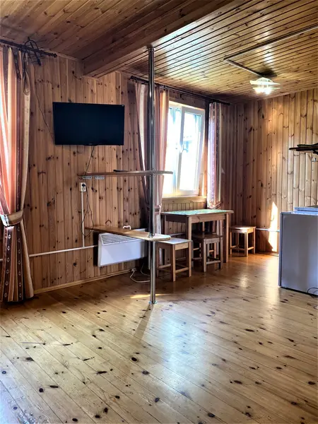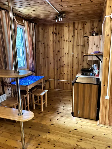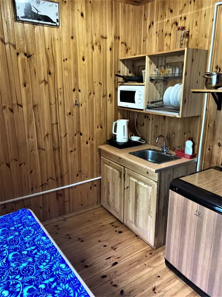 Летний домик из профилированного бруса двухъярусный на четырех человек. Две кровати, кухня, холодильник, электрический чайник, TV, санузел. На втором ярусе - два спальных места (матрасы). Душевые в отдельно стоящем здании. Открыта на сезон -с 1 мая по 30 сентября. На территории много беседок.В гостиничном номере