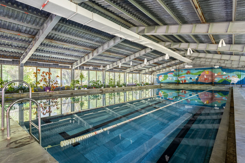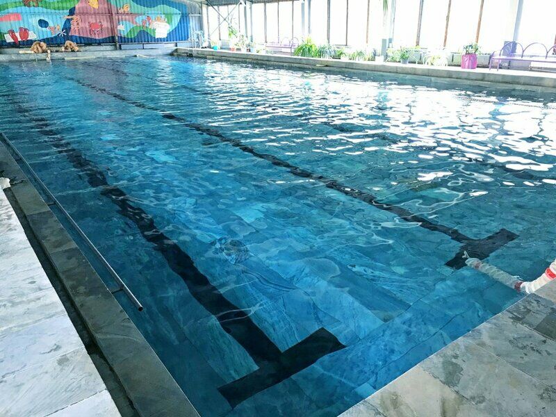 Тип бассейна: крытый бассейнВода в бассейне: подогреваемый бассейнРядом с бассейном: душТемпература в бассейне: 30 °CГлубина (диапазон): от 100 до 200 смВ отдельно стоящем спортивном комплексе, в 100 метрах от центрального здания пансионата, расположен большой бассейн с 5 дорожками, оснащенный удобным ступенчатым спуском в воду. В раздевалках бассейна имеются индивидуальные шкафчики с замками, скамейки, туалет и душ. А также сауна в мужской и женской комнате для переодевания.