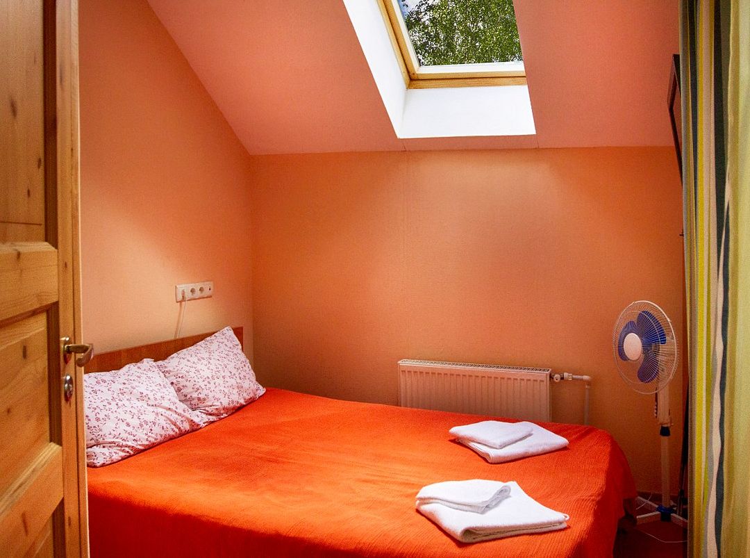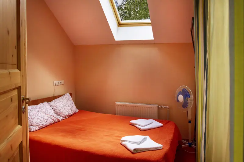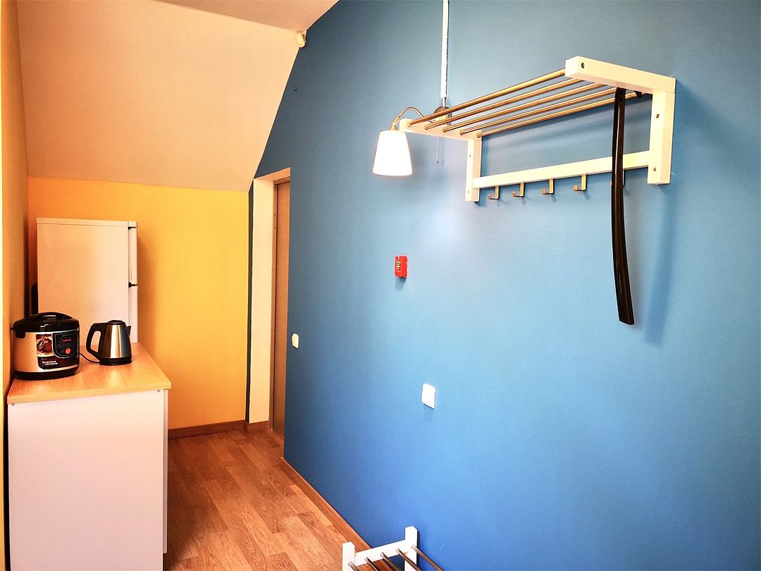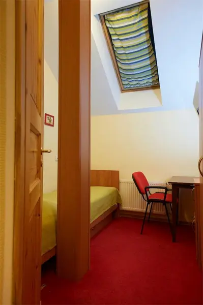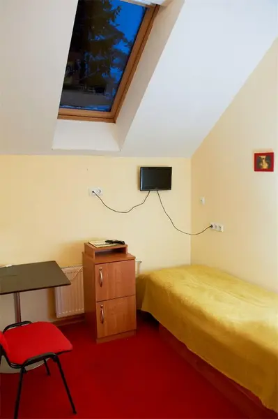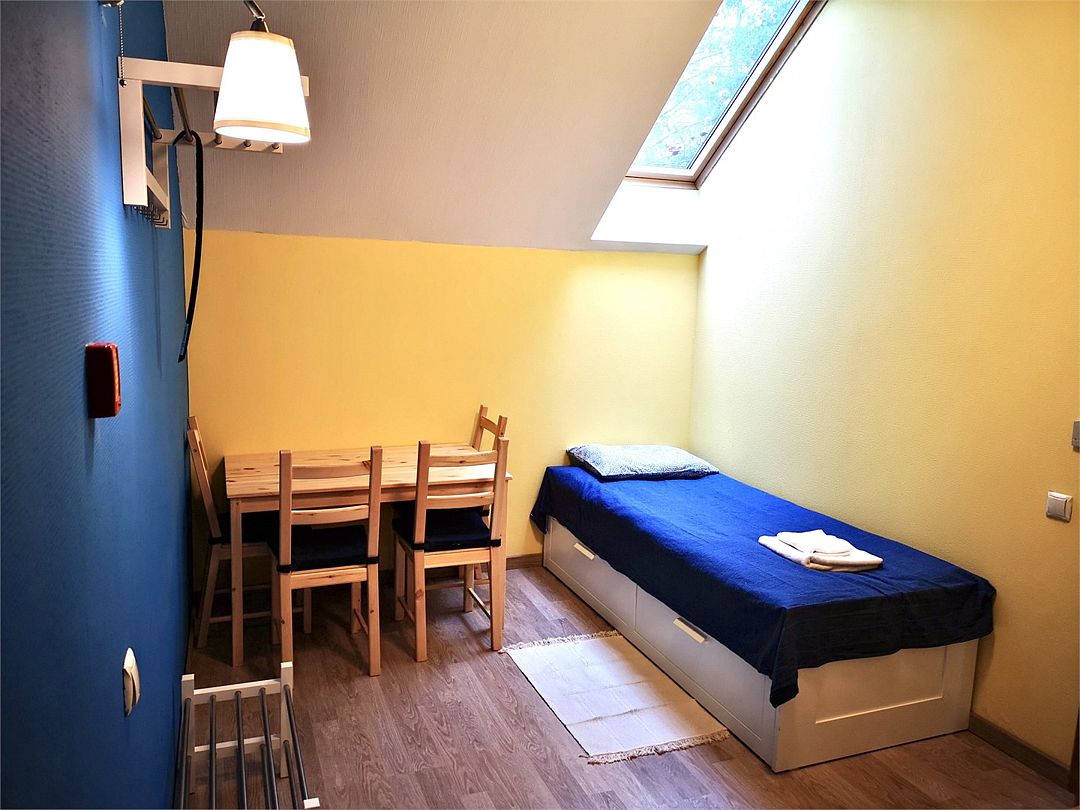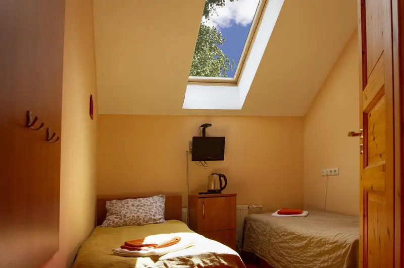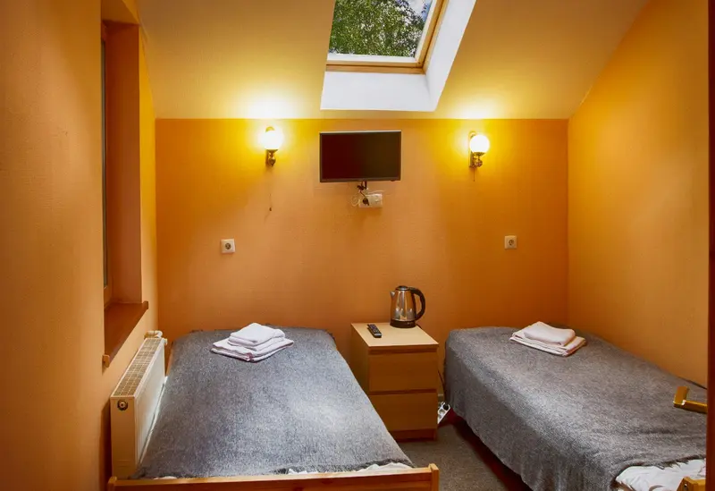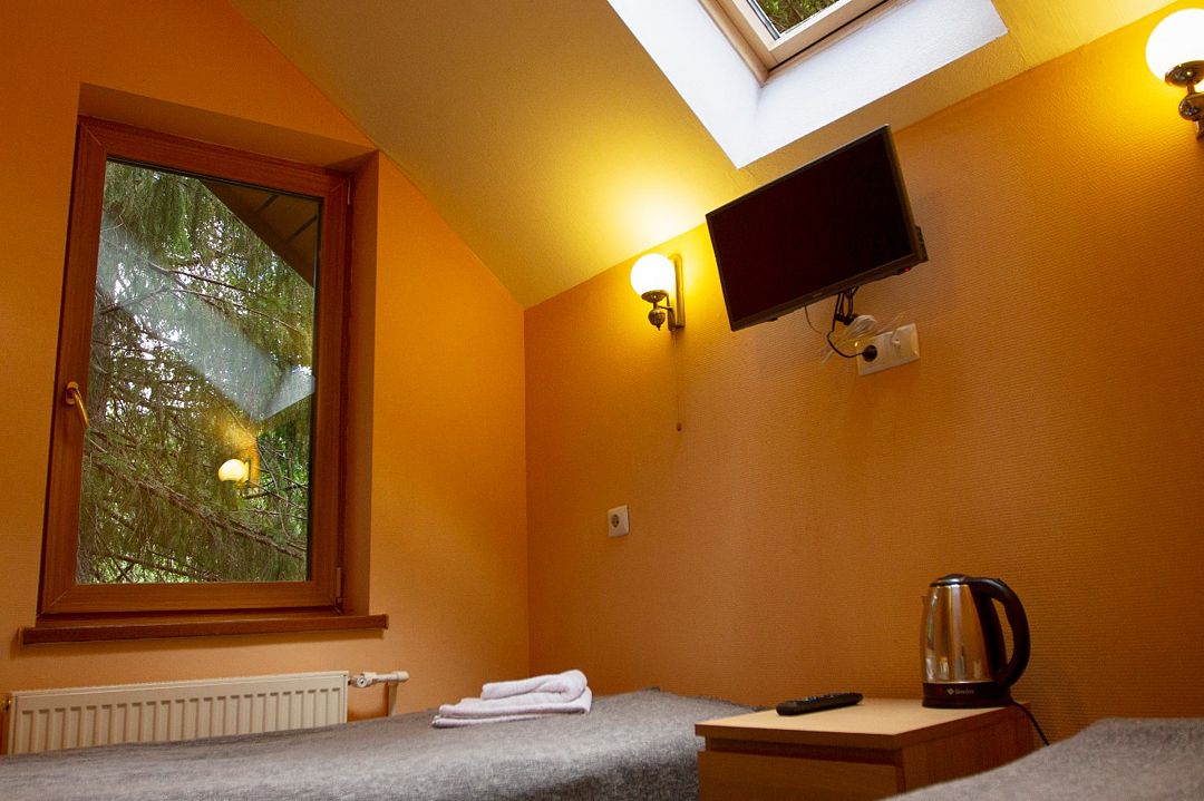В номере две односпальные кровати, ЖК-телевизор, чайник и чашки на две персоны. Ванная комната с душевой кабиной и туалетом. Окно в номере мансардное. Нет возможности установки дополнительного места и детской кроватки.