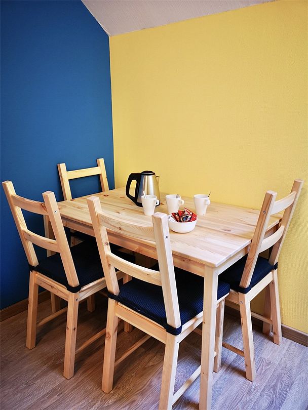На первом этаже холл для совместного отдыха. ЖК — телевизор, стол, кресла, диван. Так же имеется холодильник, микроволновая печь, вся необходимая посуда.