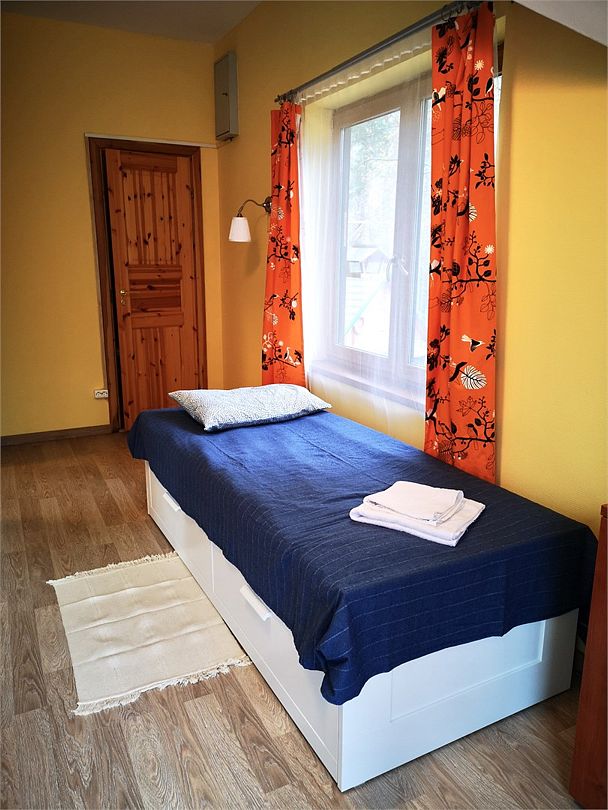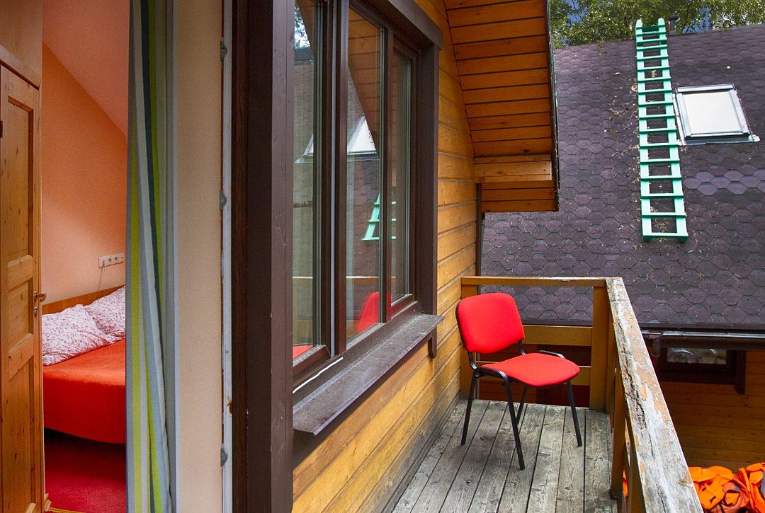 Семейный номер с двумя комнатами на 6 человек на втором этаже гостиничного комплекса. В номере две комнаты, в одной комнате диван-кровать на 2 спальных места, в другой комнате большая двуспальная кровать и диван-кровать на 2 спальных места. Одна из комнат оборудована ЖК-телевизором, креслом, шкафом для одежды. Во второй комнате установлен стол со стульями и кухонный уголок, в котором есть холодильник, мультиварка, микроволновая печь, чайник, посуда. В номере также есть своя ванная комната с душевой кабиной и туалетом. Большие окна выходят на лес и на озеро, также есть мансардное окно. Есть возможность установить детскую кровать.