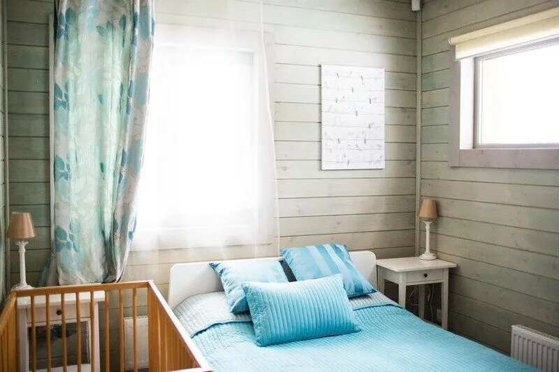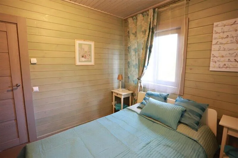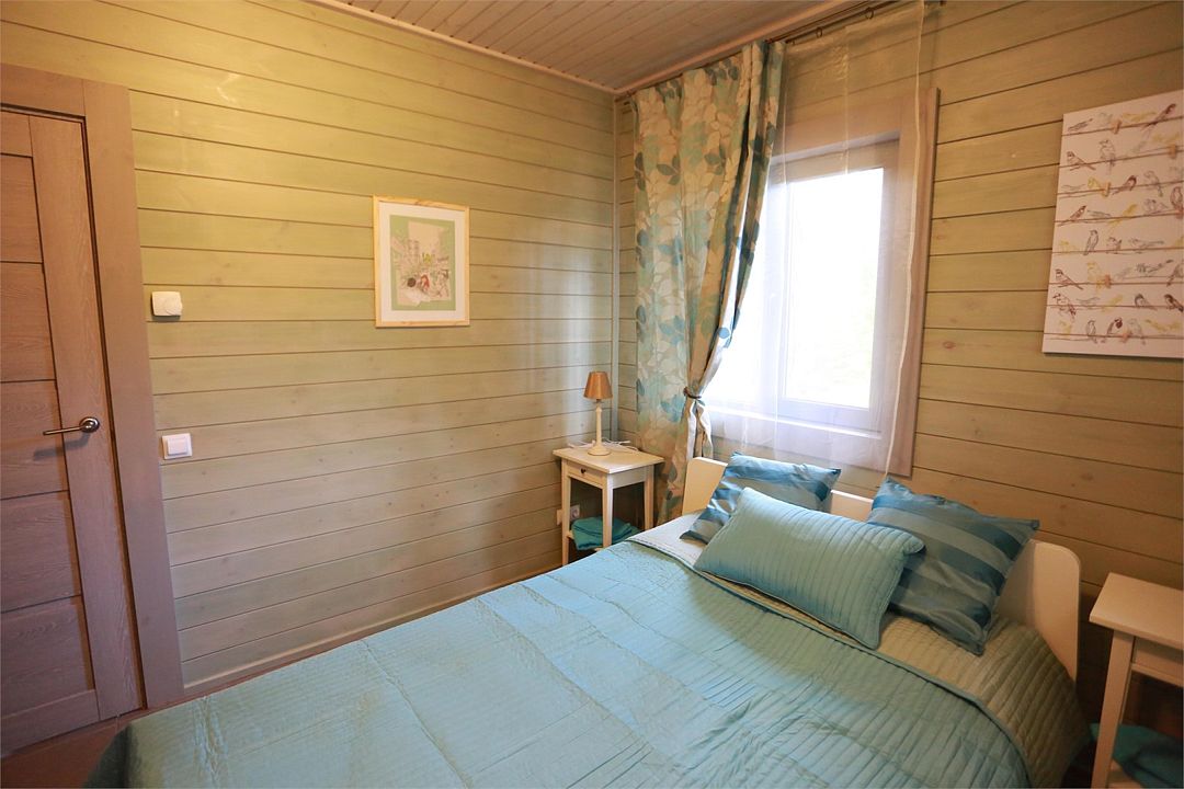 В каждой комнате две односпальных кровати. Имеется возможность установки дополнительного места либо детской кроватки. Ванная комната с душевой кабиной и туалетом. Так же домик оснащён ЖК-телевизором, системой подогрева полов. В домике имеются холодильник, большой шкаф, стол, прикроватные тумбы, чайник и чашки на 4 персоны.