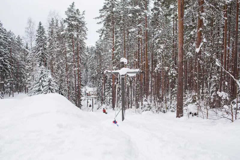 А для детей, которые просто обожают ползать, лазать и летать между деревьями, и которых трудно увести с трасс, построили мини-Норвежский парк прямо на территории «ОРЕХа»