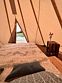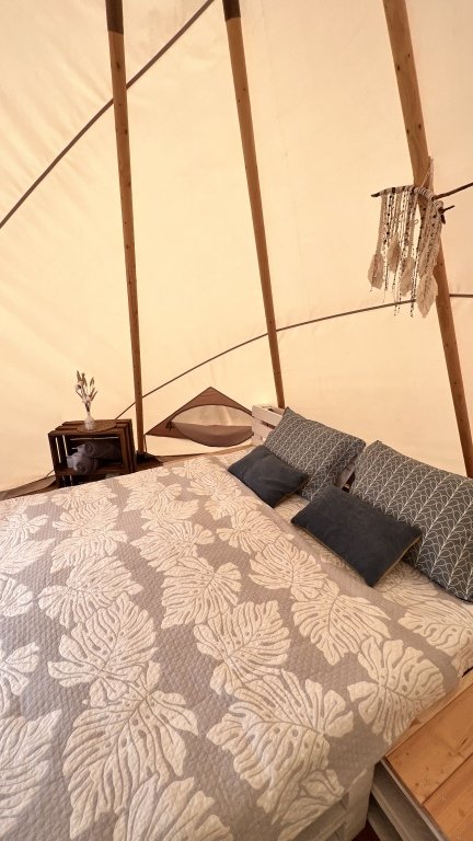 На острове, в центре лазурного озера, для проживания расположены несколько уютных палаток-типи, в каждой из которых есть двуспальная кровать с прикроватными полками, розетками, мягким подогреваемым матрасом, мини-шкаф, пуфики, гигиенический набор и уютное освещение.