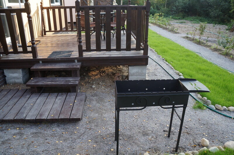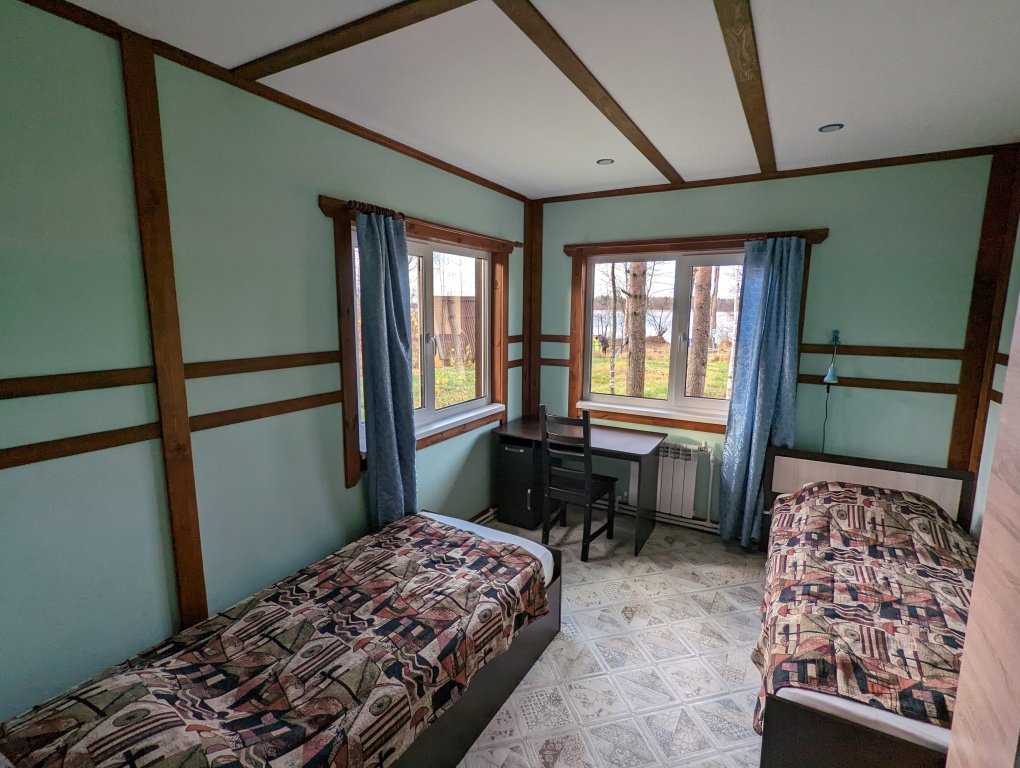 В коттедже – две спальные комнаты (в одной – двуспальная кровать, в другой – две односпальные кровати), большая гостиная с двуспальным диваном, полностью оснащенная кухня и два санузла.