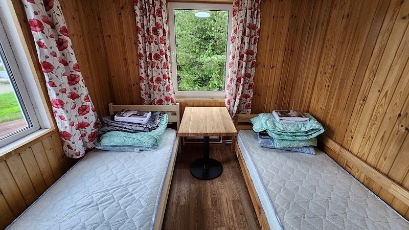 Для размещения гостей подготовлены 10 отдельных номеров с мини-холодильником в каждом из них. На каждом этаже размещено 2 современных санузла с душевой и удобная кухонная зона. Также имеется номер категории Люкс с отдельным входом, собственной ванной комнатой и туалетом, большой кухней и террасой с видом на озеро.