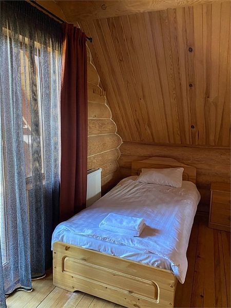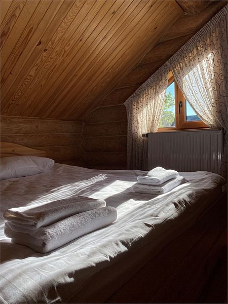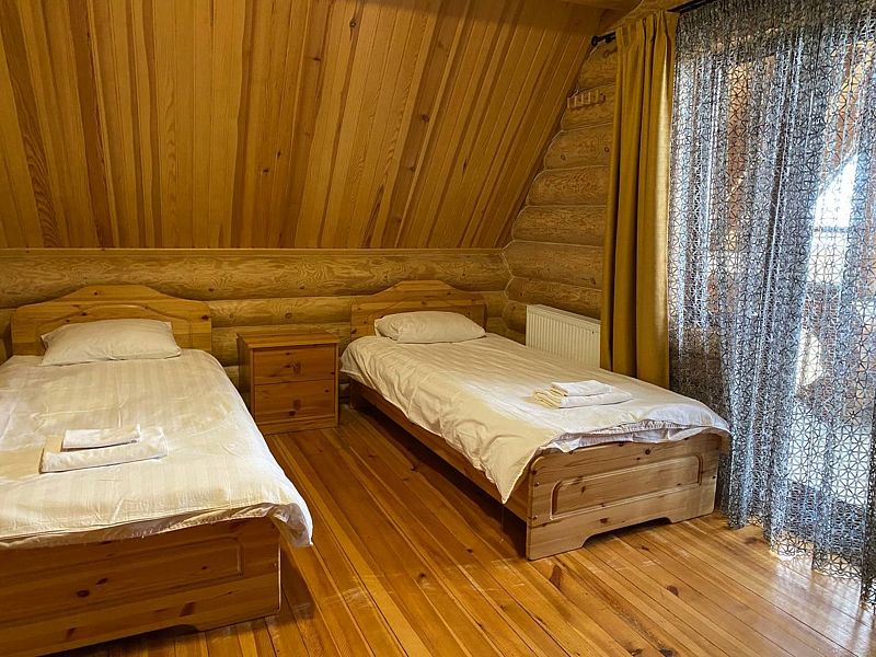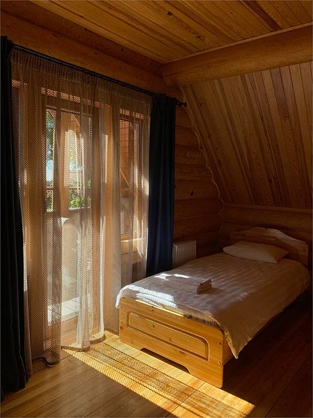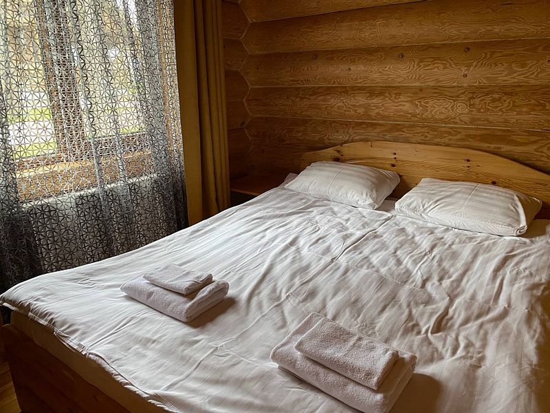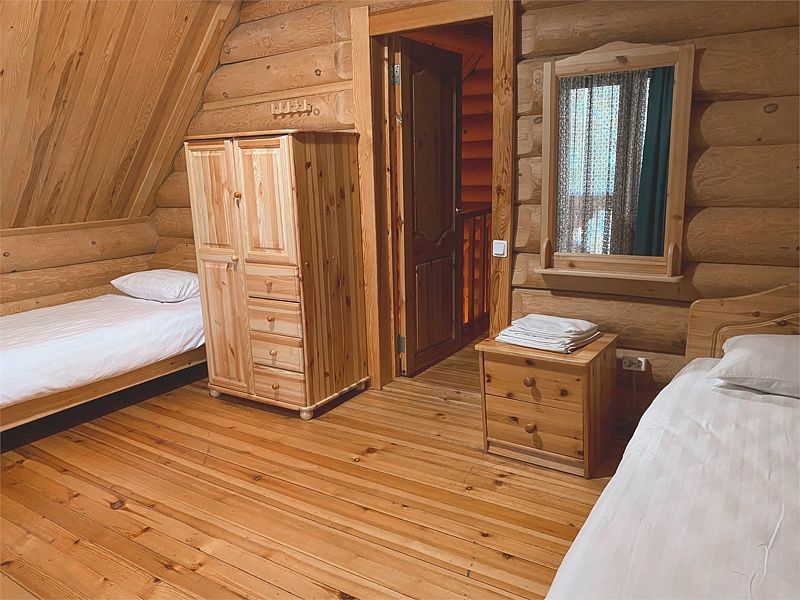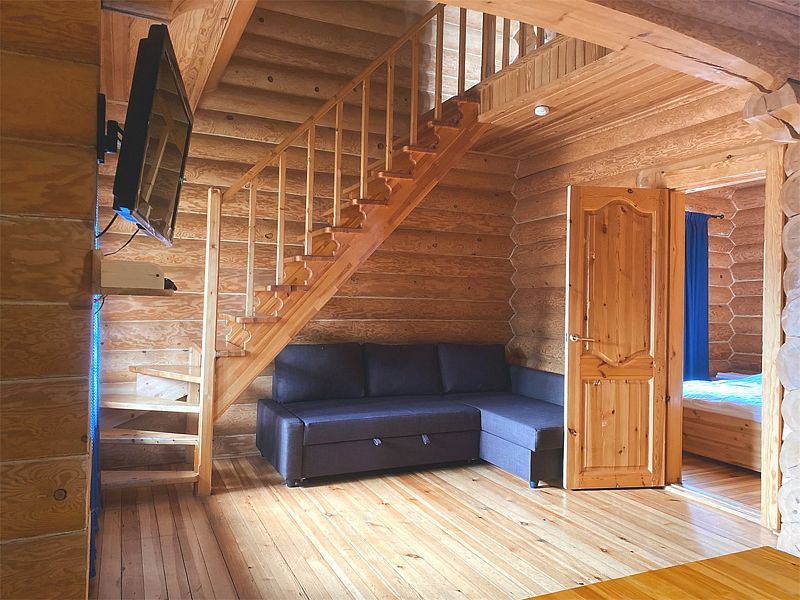 Королевский дом — самый большой из всех наших домов. На первом этаже находятся: обеденная зона, кухня с выходом на веранду, душевая, раскладной диван и спальня с двуспальной кроватью. На втором этаже находятся две спальни — одна с двумя односпальными кроватями, вторая с одной двуспальной. На втором этаже также есть выход на балкон.