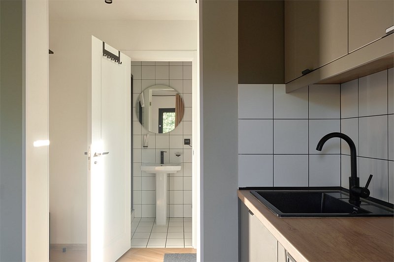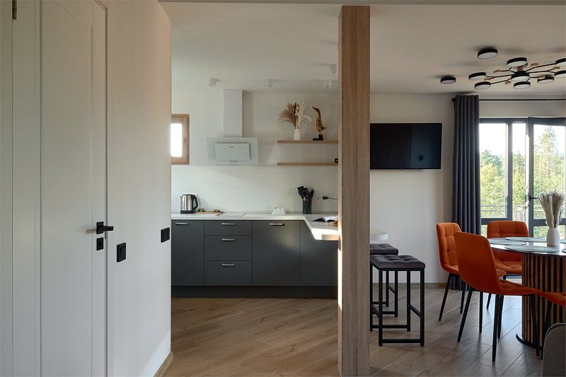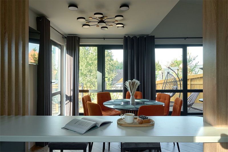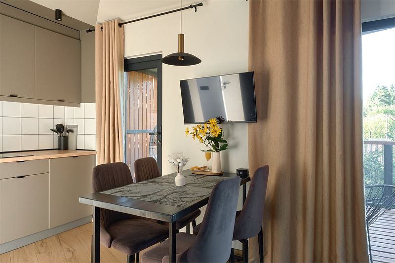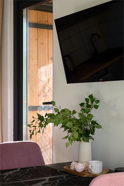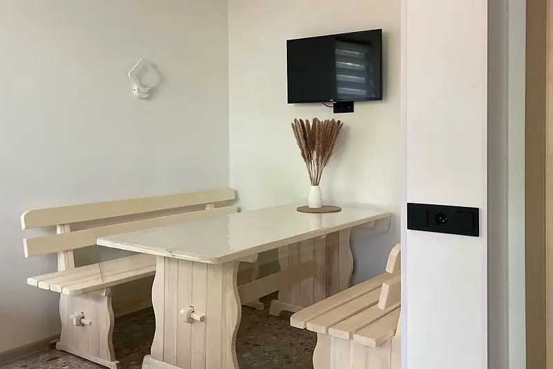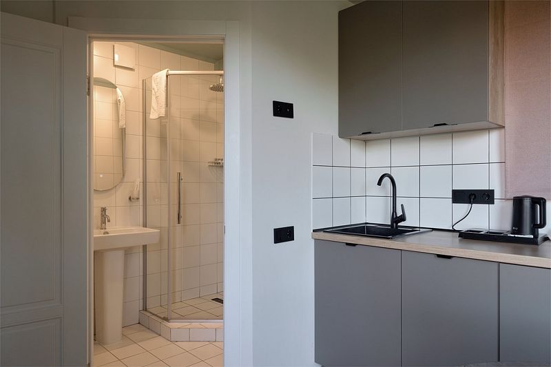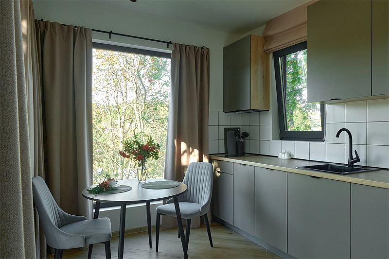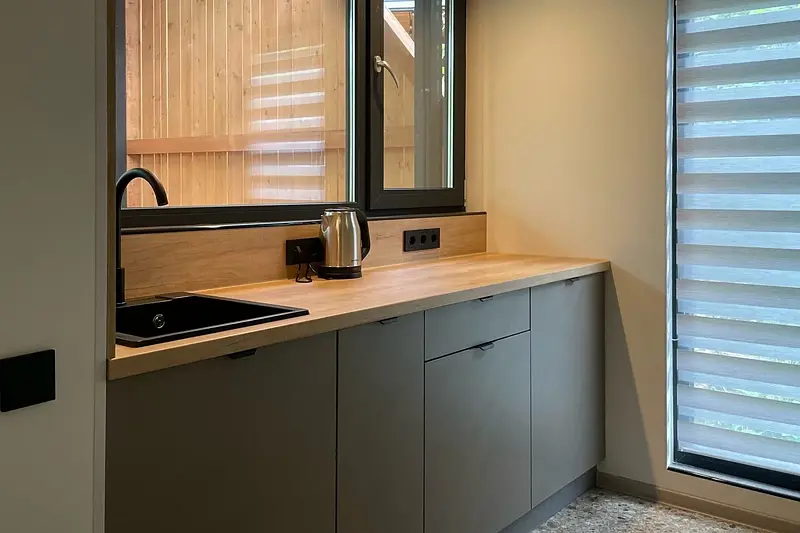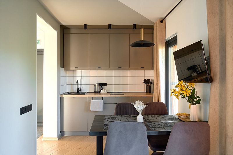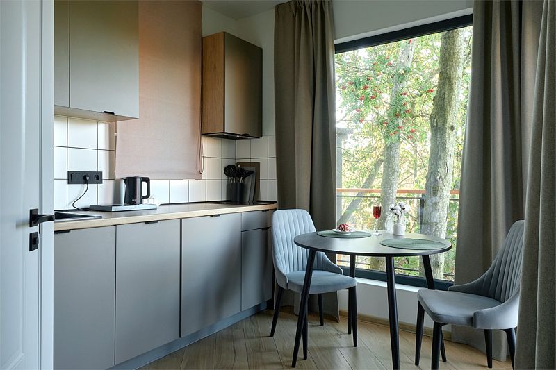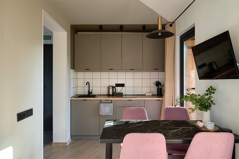 Уютная комната для отдыха с кухней и обеденным столом станет идеальным местом для приятных встреч с друзьями и семьей. Вы сможете насладиться травяным чаем, сушками, джемом и освежающей водой из кувшина.