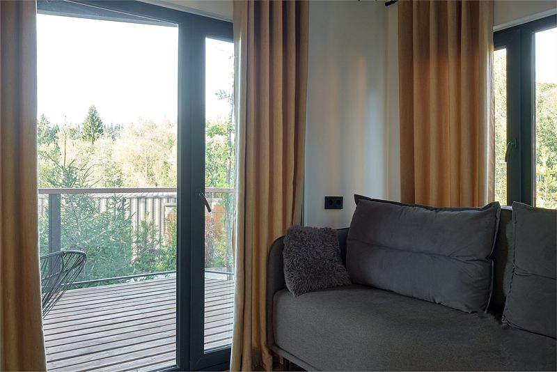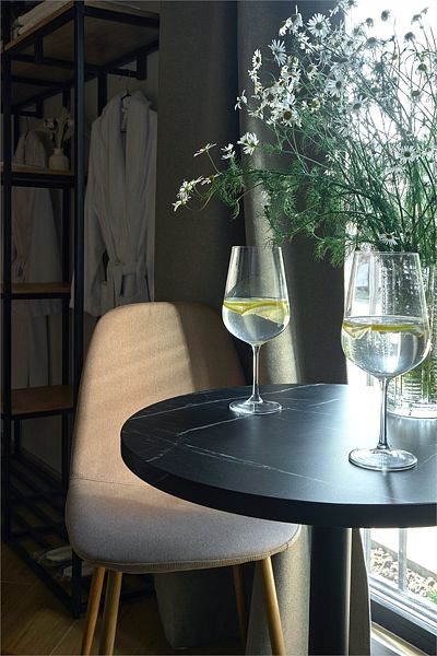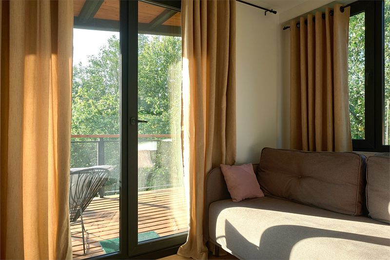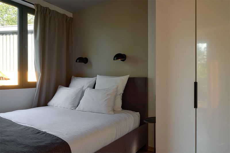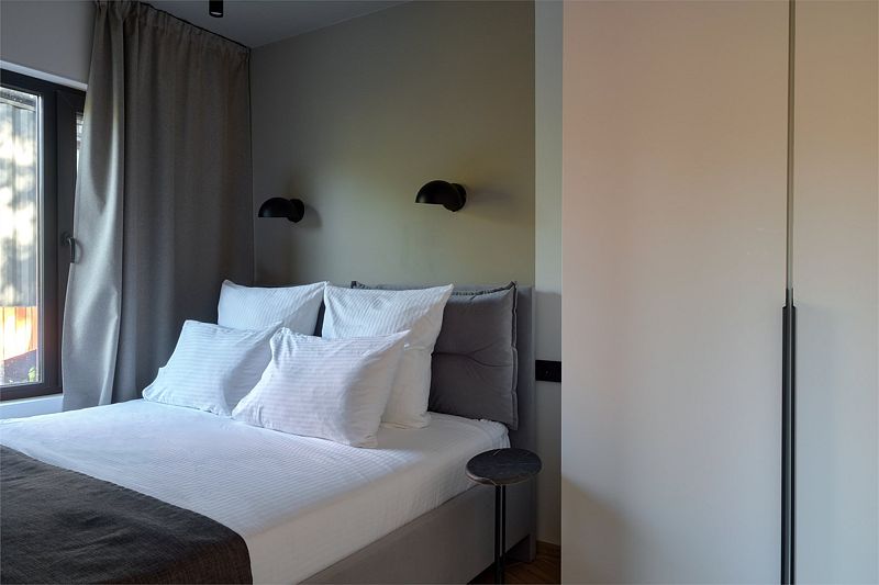 Дизайн отеля выполнен в стиле минимализм: компактные коттеджи с интерьером в нежных тонах, обилие света, панорамные окна, из которых открывается чудесный вид на окрестности. Все сделано так, чтобы, находясь здесь, вы ощутили единение с природой.