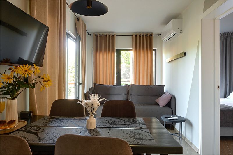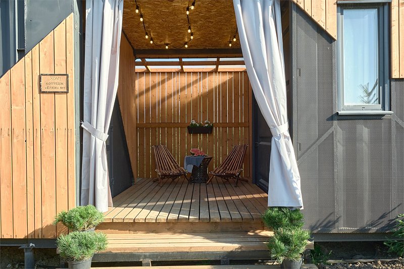 Коттедж с двумя спальнями и просторной гостиной. Отличный выбор для большой семьи или компании друзей! Оборудован двумя личными мебелированными террасами, а также собственной мангальной зоной.