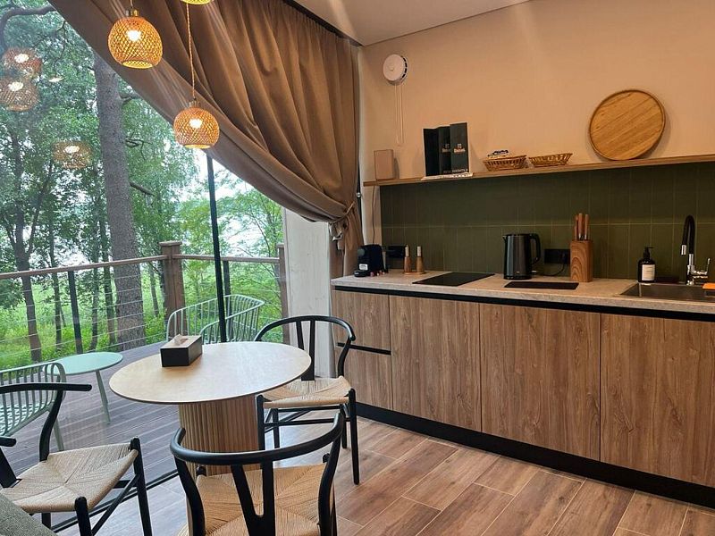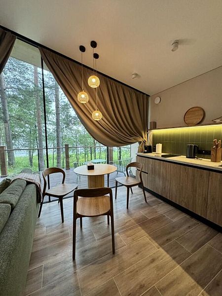 Эстетичный интерьер в сочетании с натуральными материалами. Просторное пространство для отдыха с большим столом из африканского дерева и мягкой зоной. Панорамный вид на озеро и вековые сосны. Великолепная русская парная с дровяной печью. В отделке использована сухостойная карельская сосна Кело, благодаря которой, можно наслаждаться хвойным ароматом в процессе парения. На террасе установлена купель с ледяной артезианской водой. В стоимость аренды на 6 человек входит: баня с зоной отдыха, парная зона, банные принадлежности и угощения.