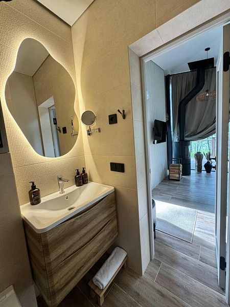 Читать полностьюЭстетичный интерьер в сочетании с натуральными материалами. Просторное пространство для отдыха с большим столом из африканского дерева и мягкой зоной. Панорамный вид на озеро и вековые сосны. Великолепная русская парная с дровяной печью. В отделке использована сухостойная карельская сосна Кело, благодаря которой, можно наслаждаться хвойным ароматом в процессе парения. На террасе установлена купель с ледяной артезианской водой. В стоимость аренды на 6 человек входит: баня с зоной отдыха, парная зона, банные принадлежности и угощения.
