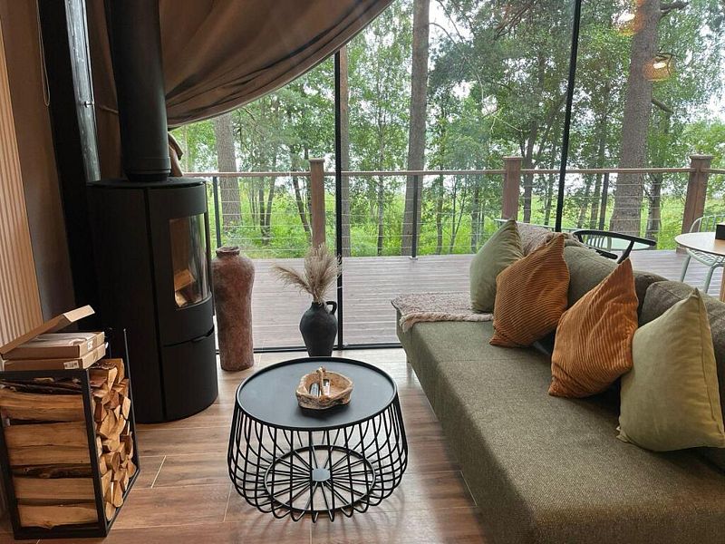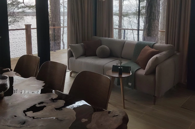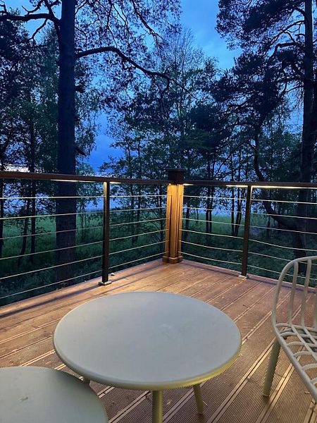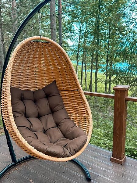 На улице большая терраса с уличной мебелью, где можно наслаждаться отдыхом на свежем воздухе с видом на озеро и лес.