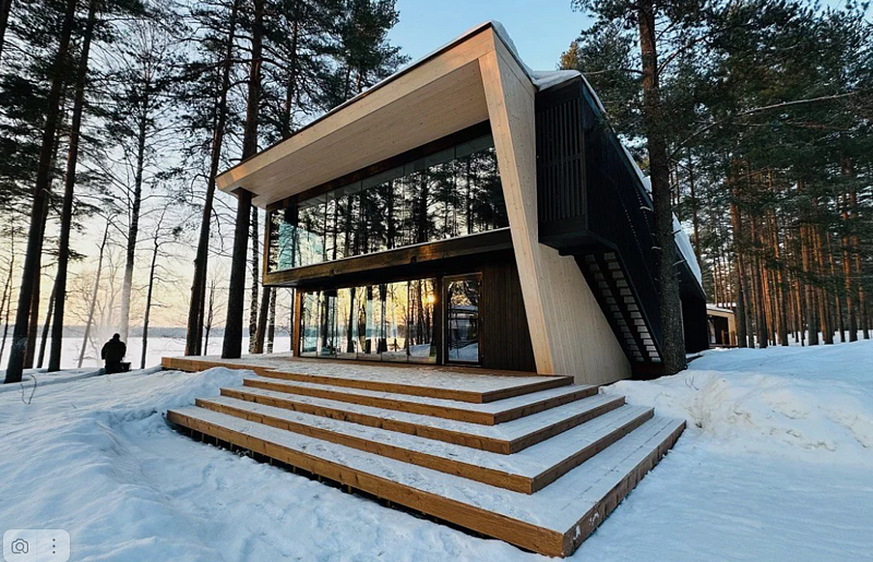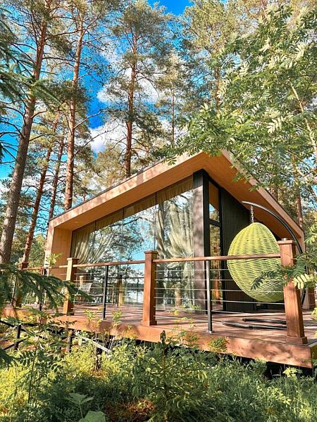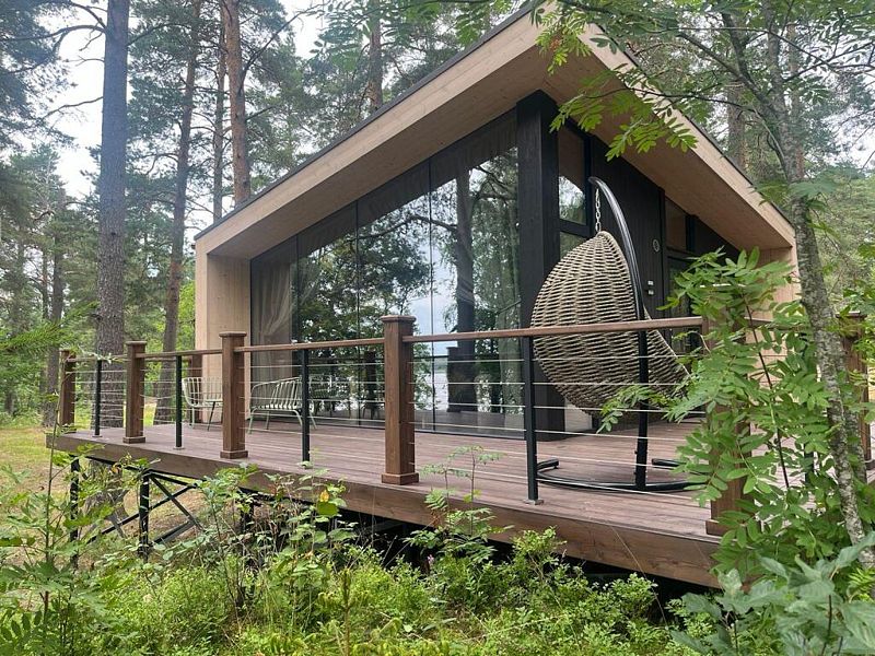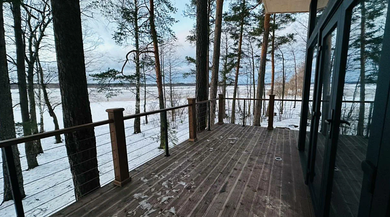 Панорамный коттедж с большой террасой, оборудованной уличной мебелью, откуда открывается потрясающий вид на озеро и лесной массив. Здесь вы сможете насладиться комфортом и свежим воздухом, отдохнув от городской суеты.