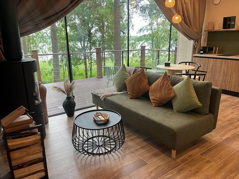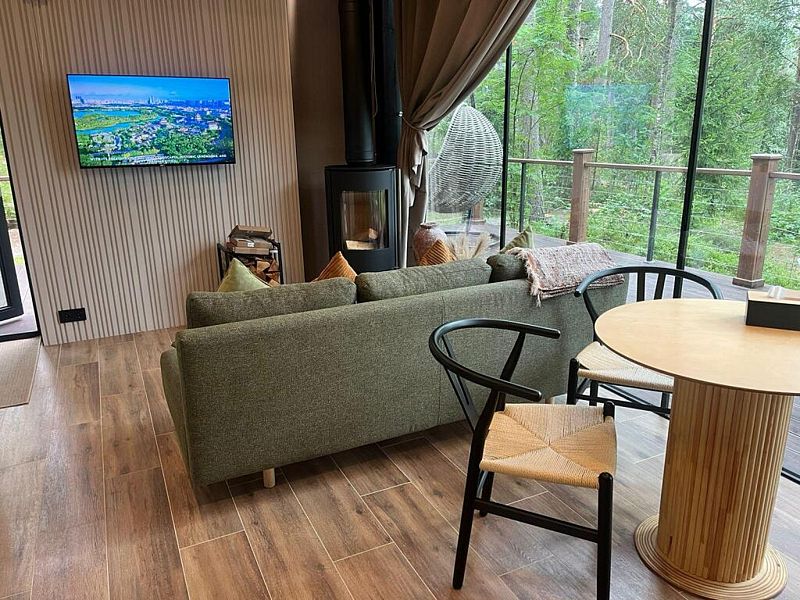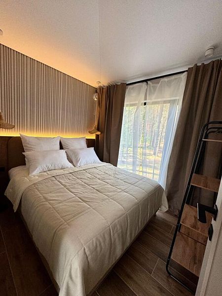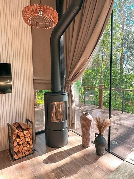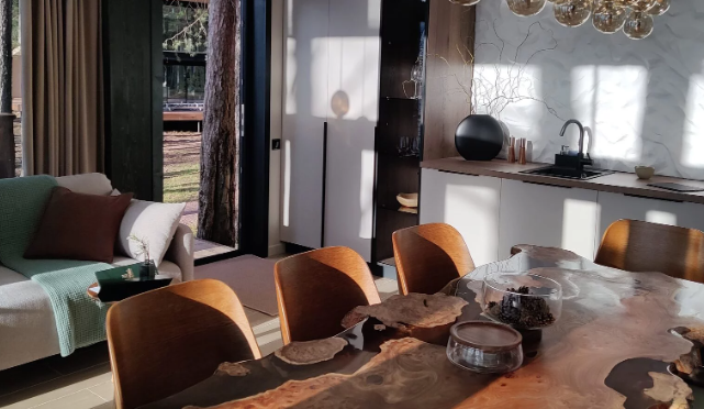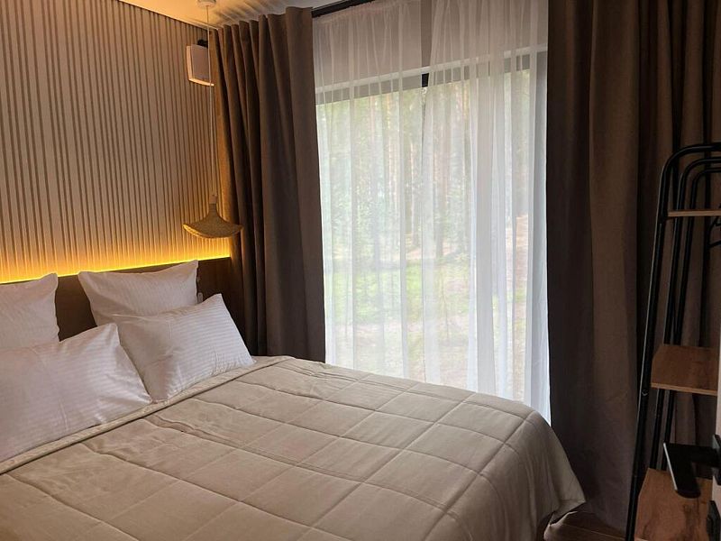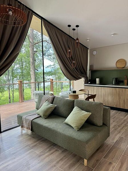 Панорамный коттедж c двумя спальнями, просторной гостиной с камином, функциональной кухней и двумя санузлами. Интерьер выполнен в стиле джапанди: экологичные материалы, природные фактуры, натуральные цвета и яркие акценты.
