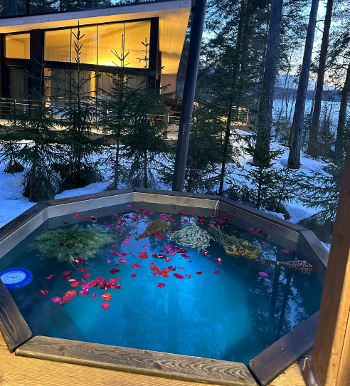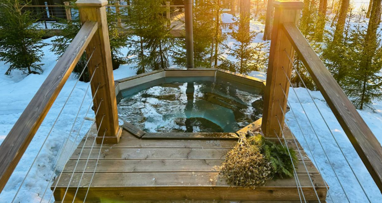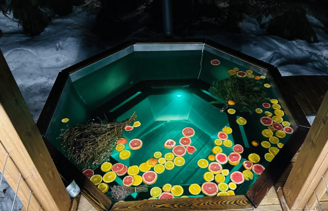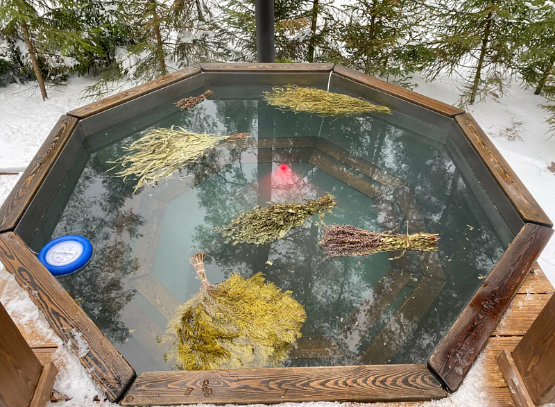 Ритуал парения в банном чане - это прекрасная возможность уединиться с природой и насладиться прекрасным отдыхом с натуральными компонентами, которыми наполняется чан. Вода в чане в меру горячая и прогревает тело медленнее и глубже, чем горячий сухой пар, и все это в окружении живописных сосен. Вода в чане разогревается примерно до 45 градусов.