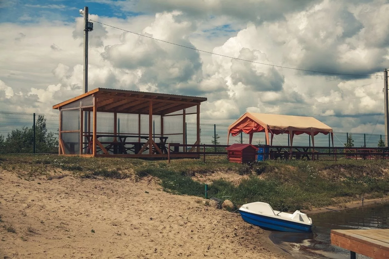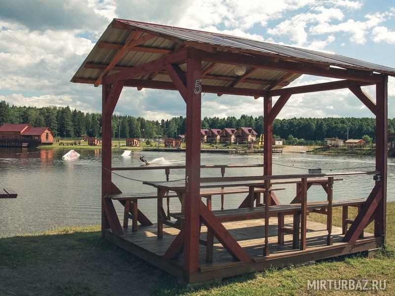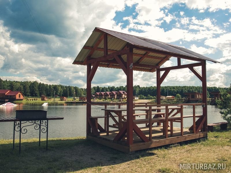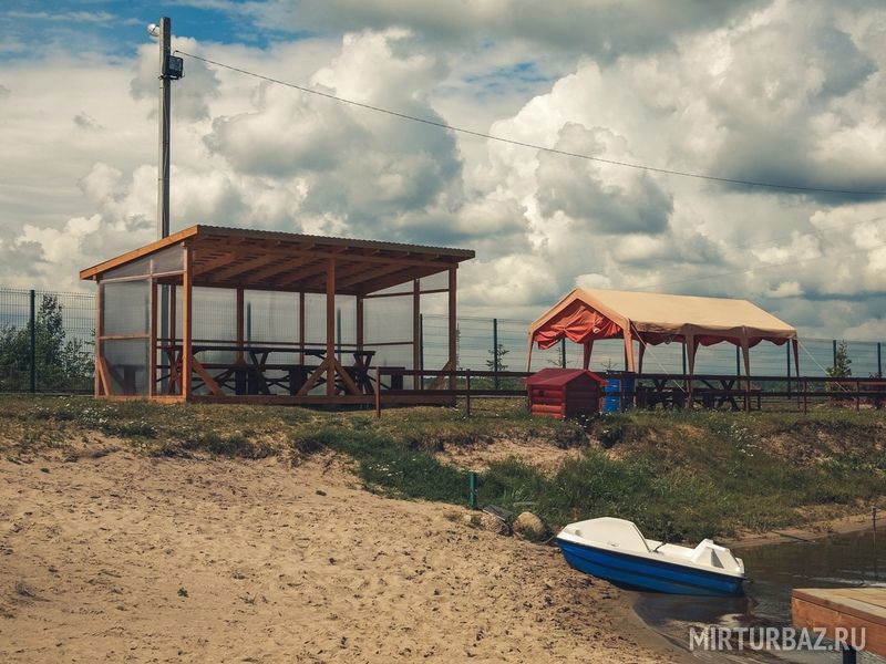 На территории базы отдыха есть небольшие открытые беседки, оборудованные мангалом и, рассчитанные на компанию до 10 человек. Беседки находятся прямо на берегу озера в непосредственной близости от песчаного пляжа, и из них открывается прекрасный вид на всю территорию .