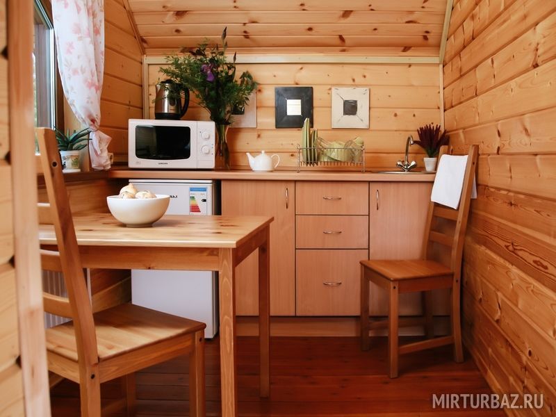 В каждом доме есть отопление, санузел с душем, кабельное телевидение. В кухне есть посуда и столовые приборы, в спальнях – постельное белье и полотенца для лица и тела. К каждому дому прилагаются мангалы.