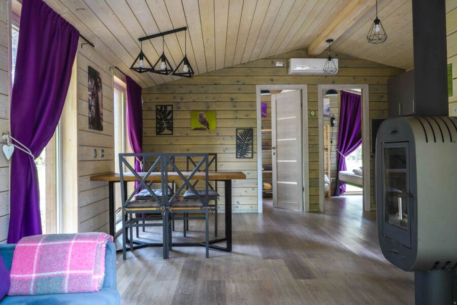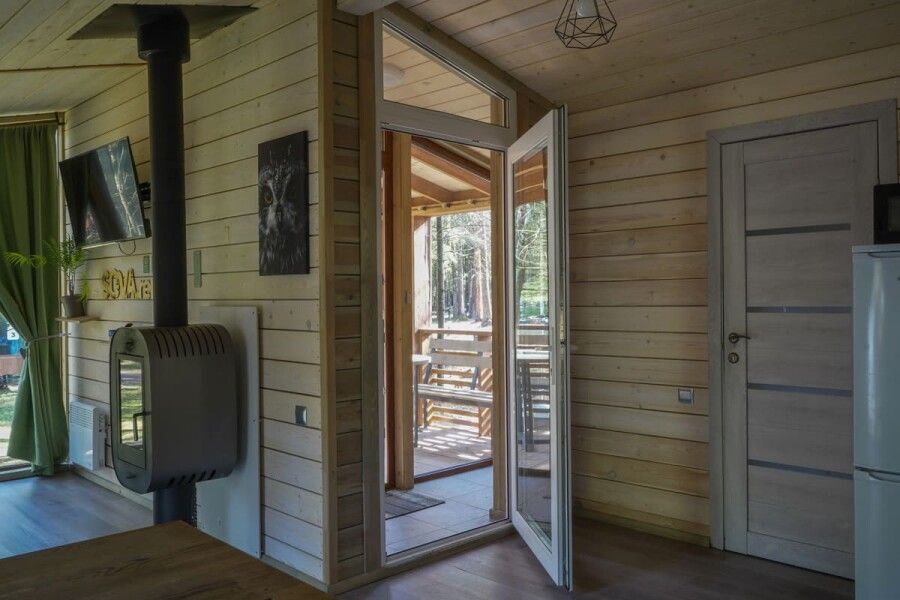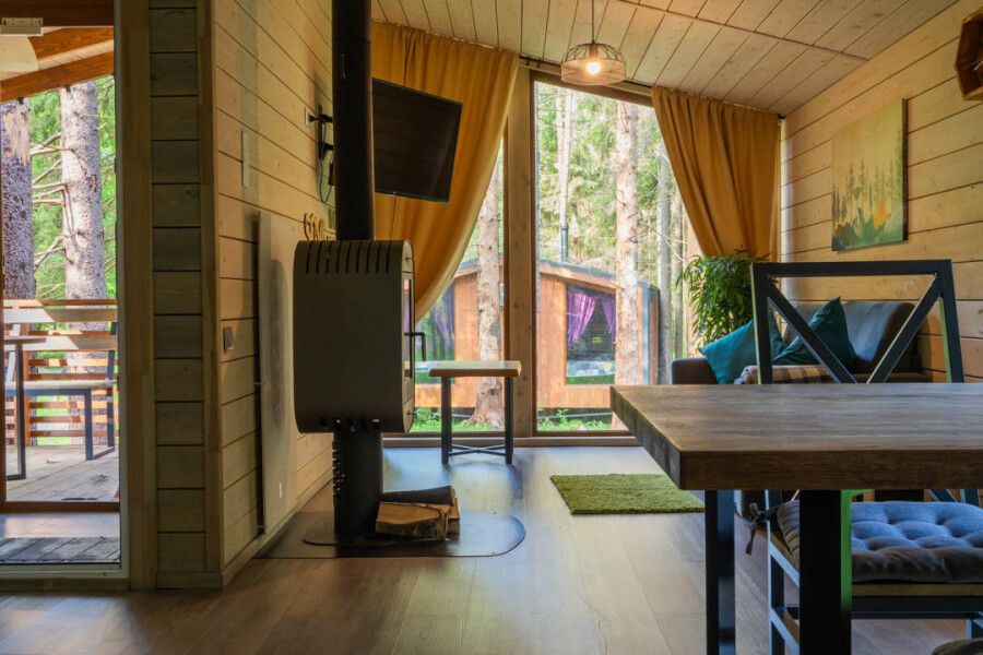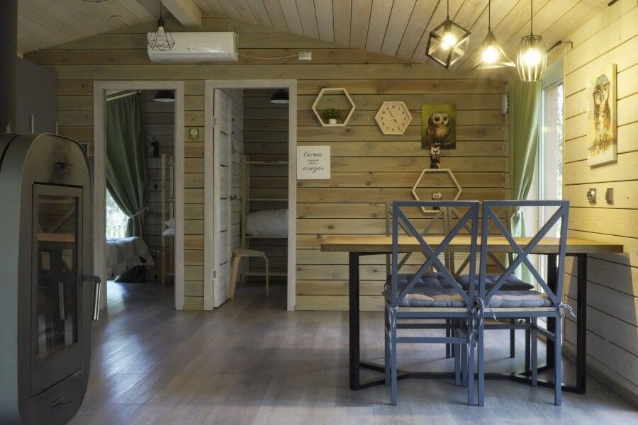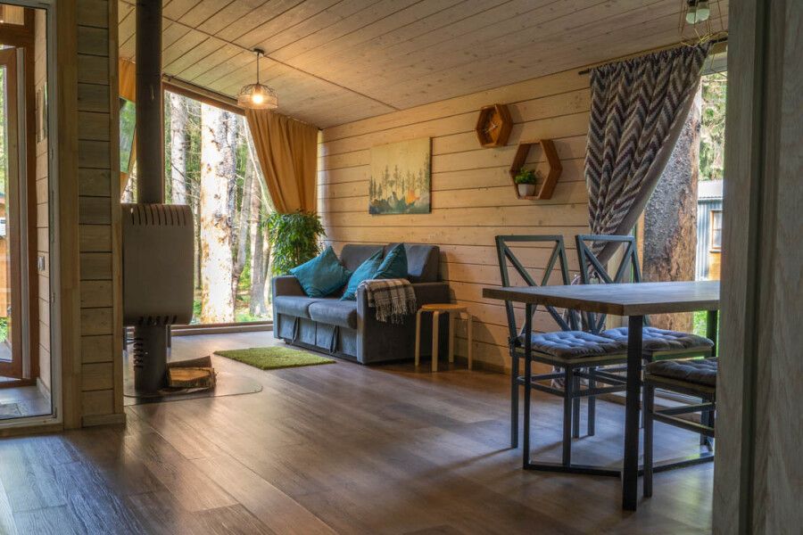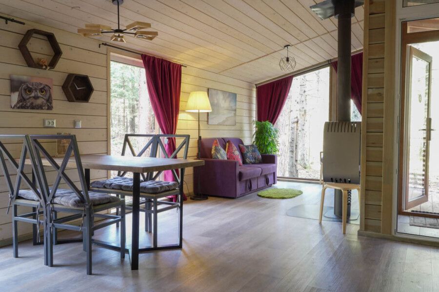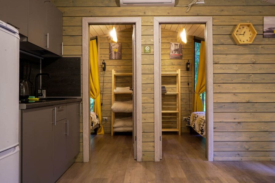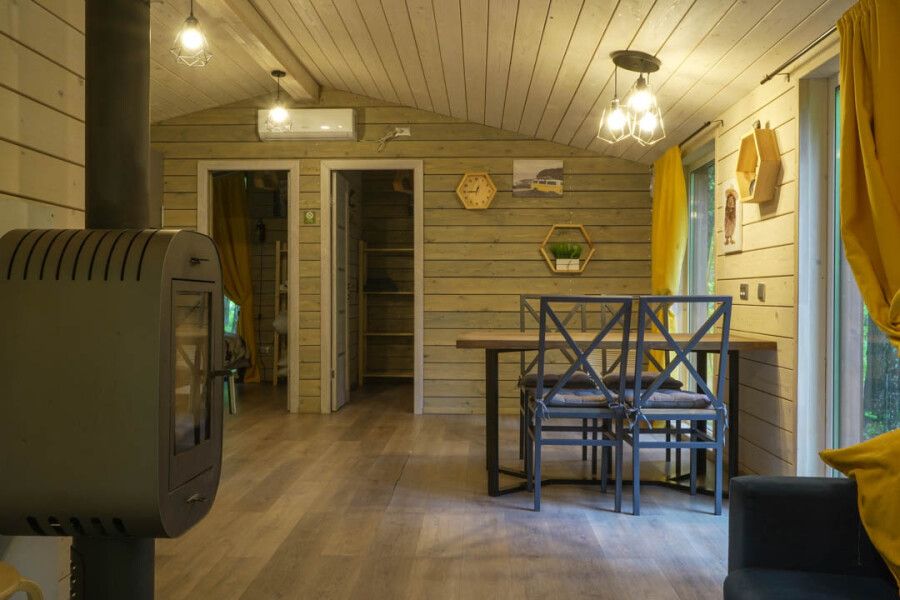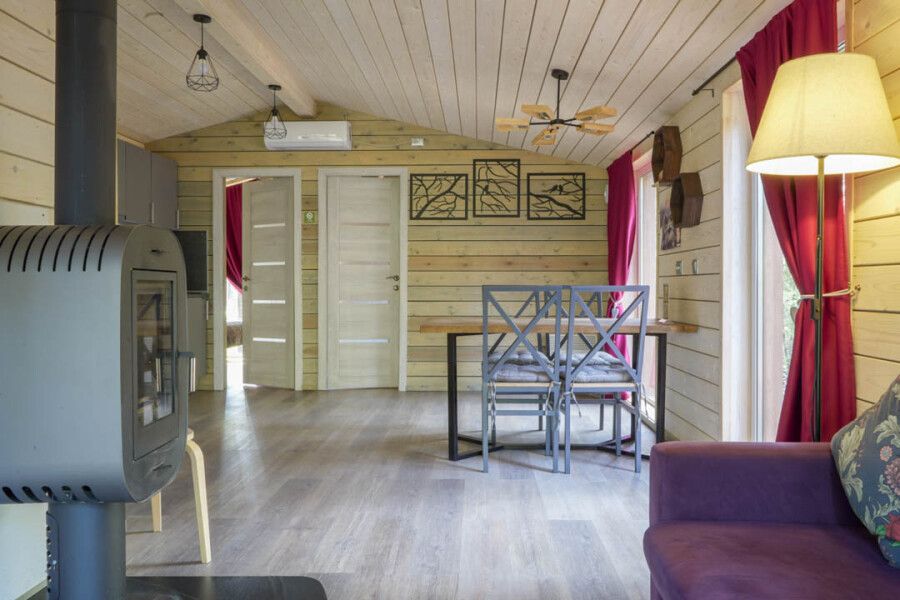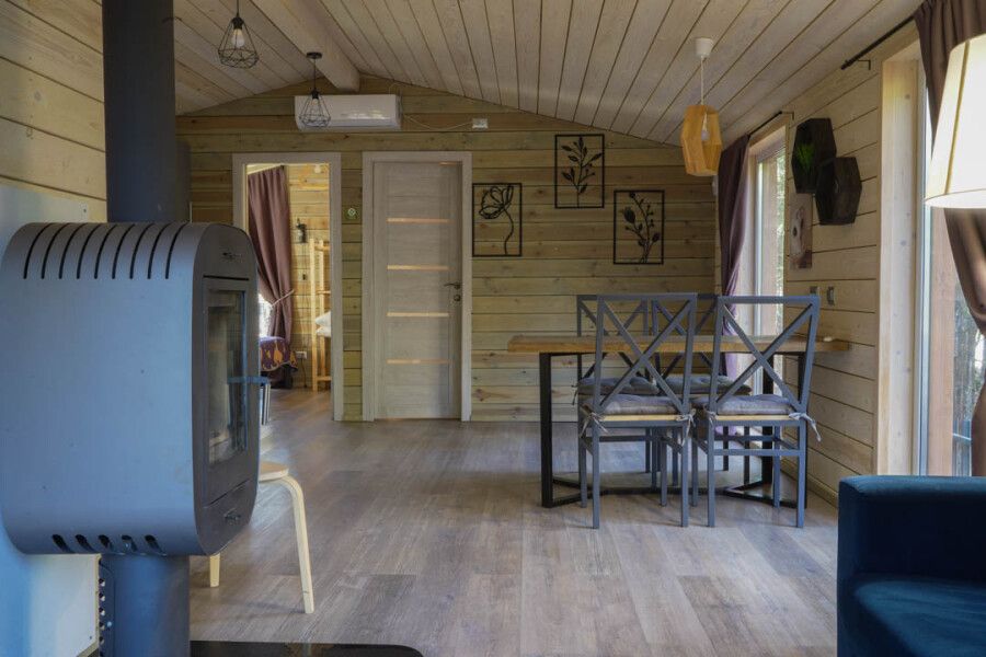 Каждый дом имеет общую площадь 60 м² и включает просторную кухню-гостиную с дровяной печью и раскладным двухместным диваном. Кухонная зона полностью оснащена для приготовления пищи: варочная панель, микроволновая печь, двухкамерный холодильник и посуда на шесть человек. Снаружи установлен индивидуальный мангал.