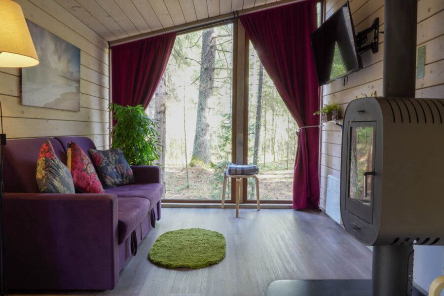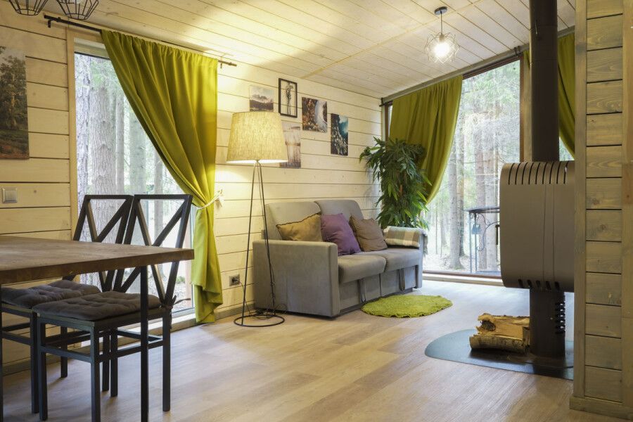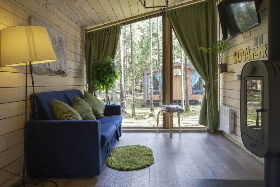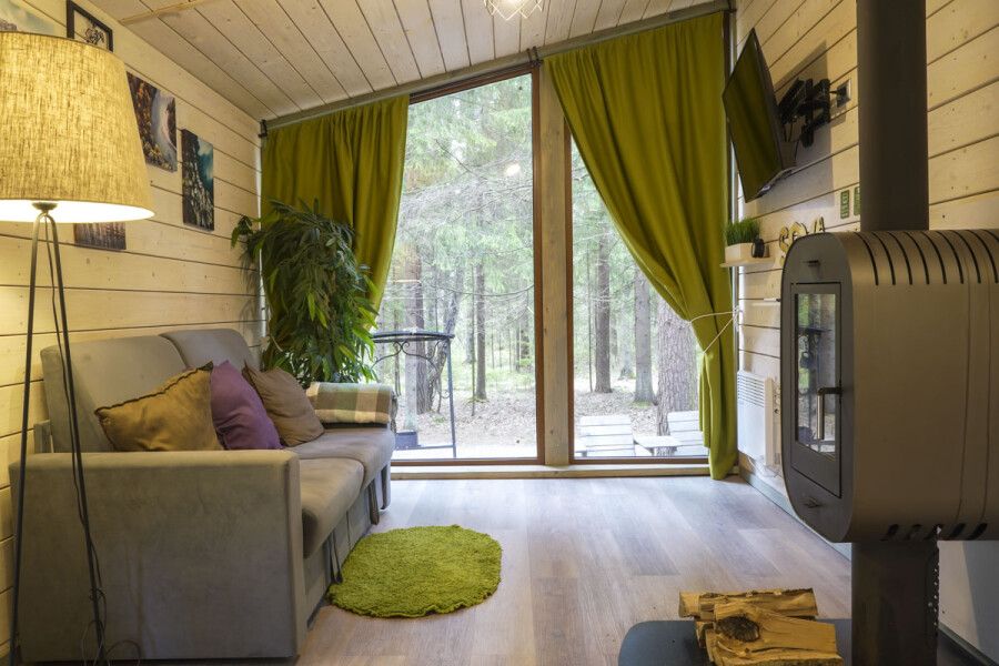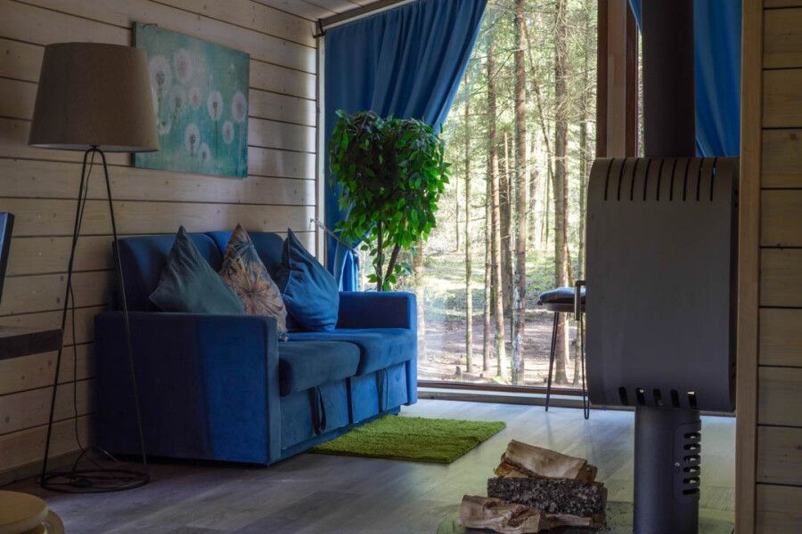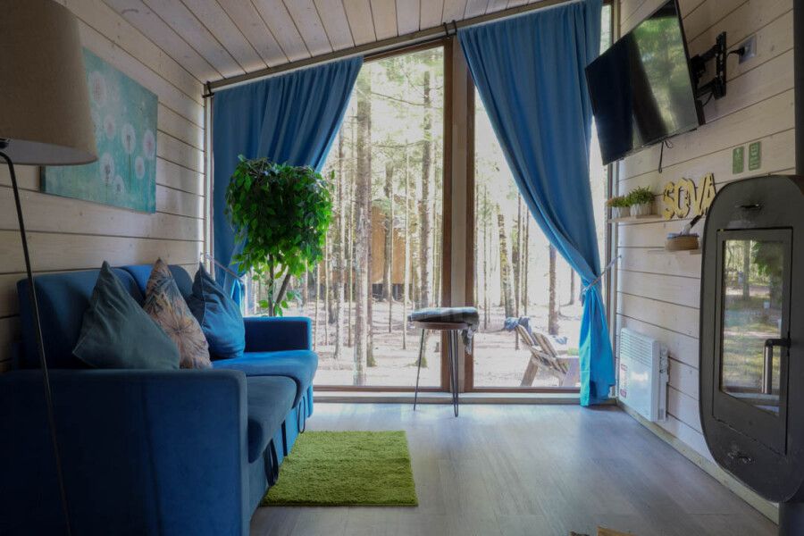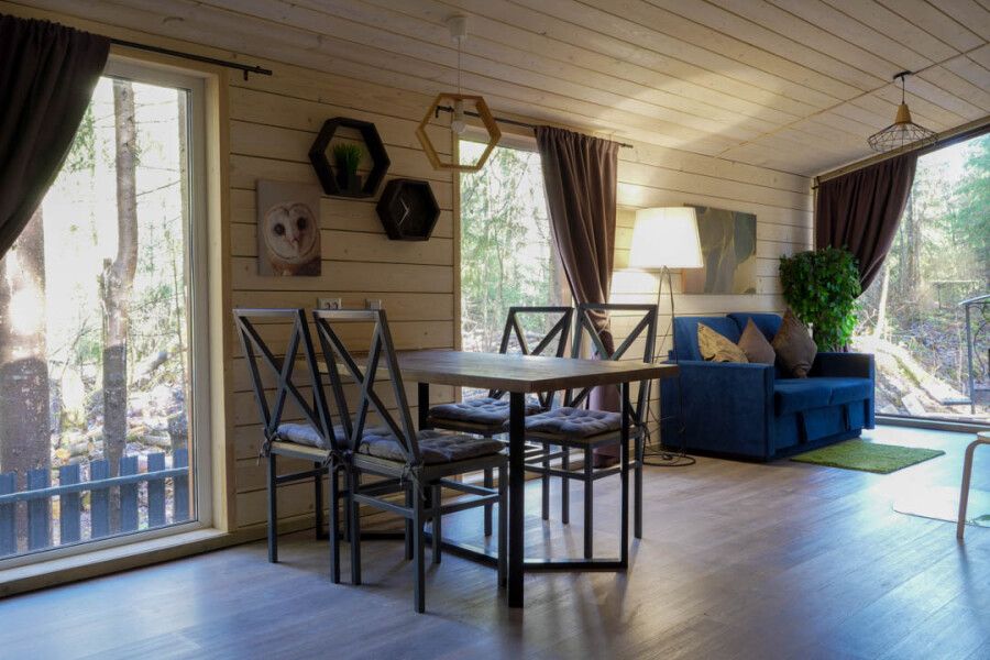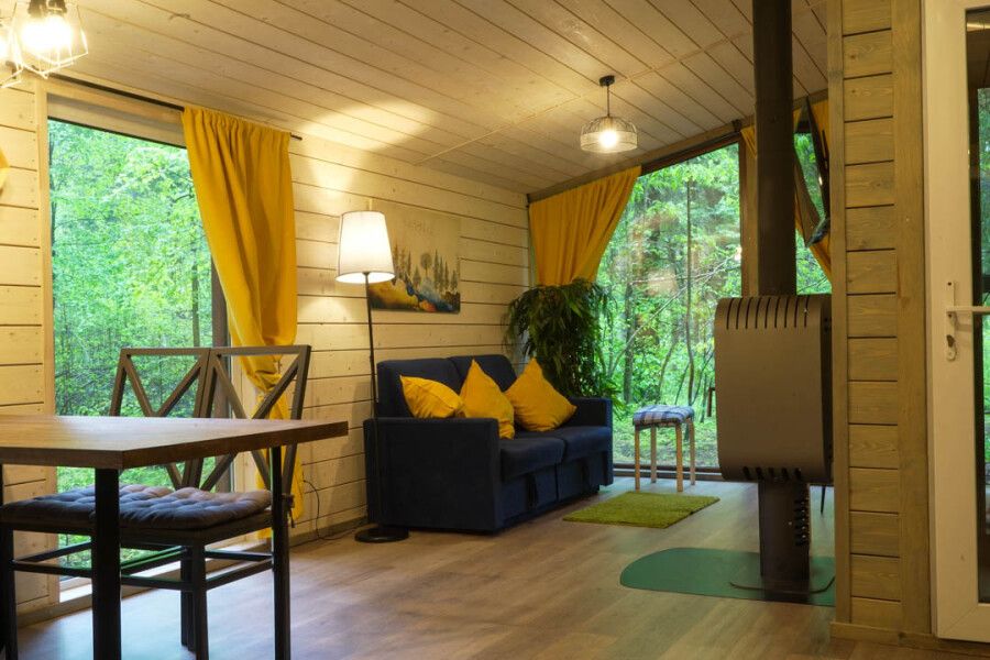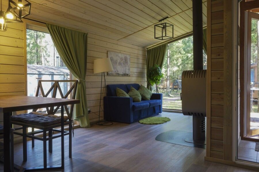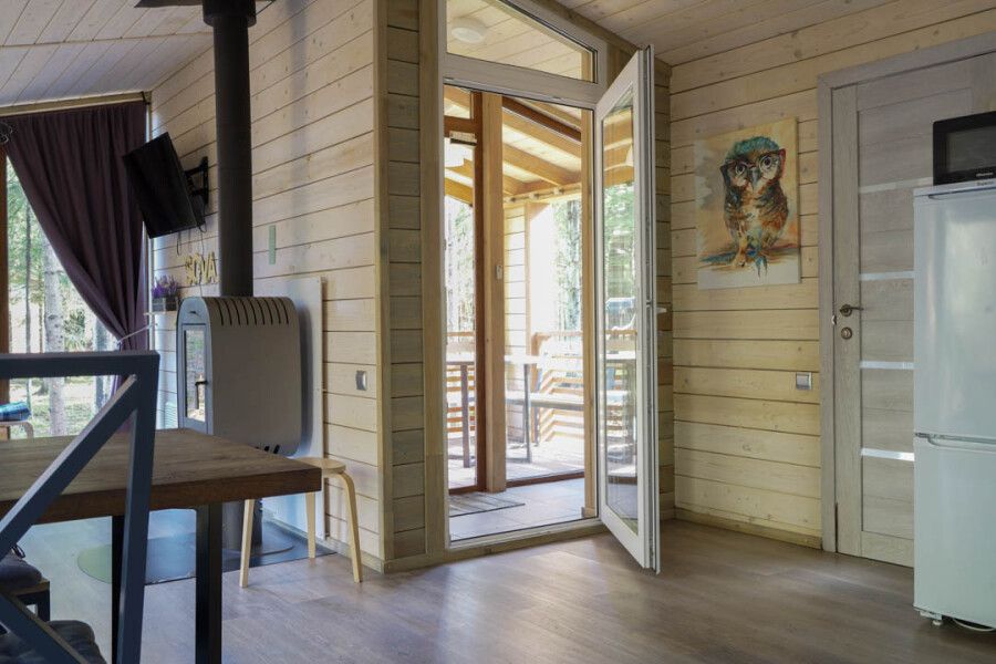 Каждый дом имеет общую площадь 60 м² и включает просторную кухню-гостиную с дровяной печью и раскладным двухместным диваном. Кухонная зона полностью оснащена для приготовления пищи: варочная панель, микроволновая печь, двухкамерный холодильник и посуда на шесть человек. Снаружи установлен индивидуальный мангал.