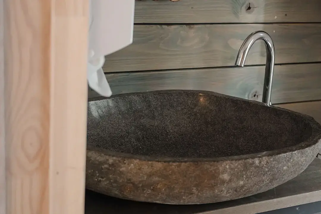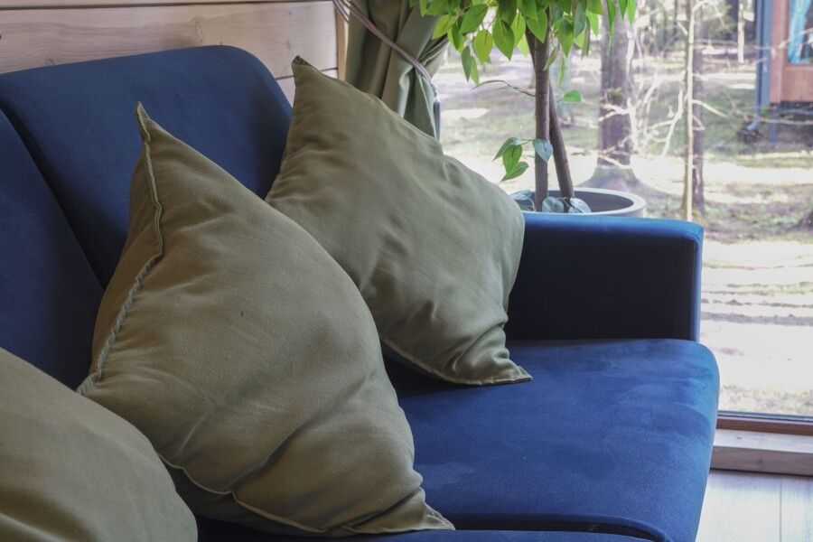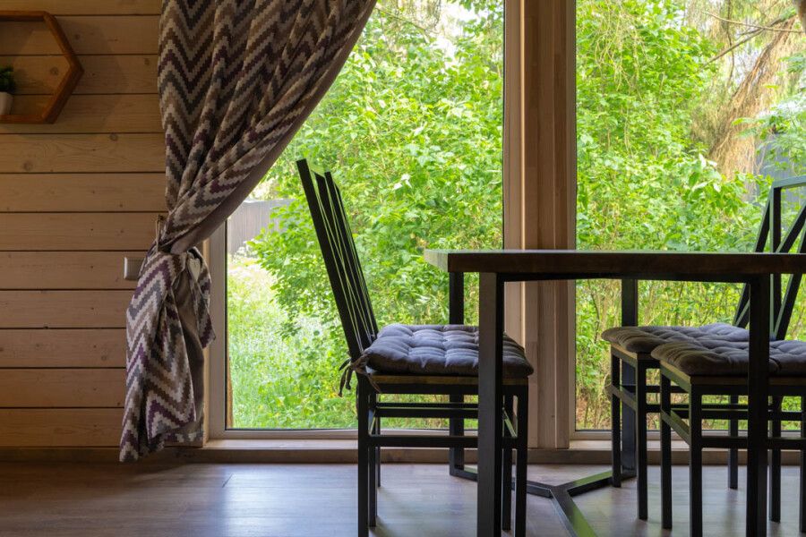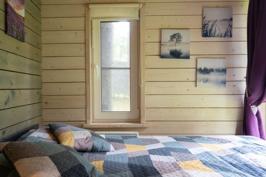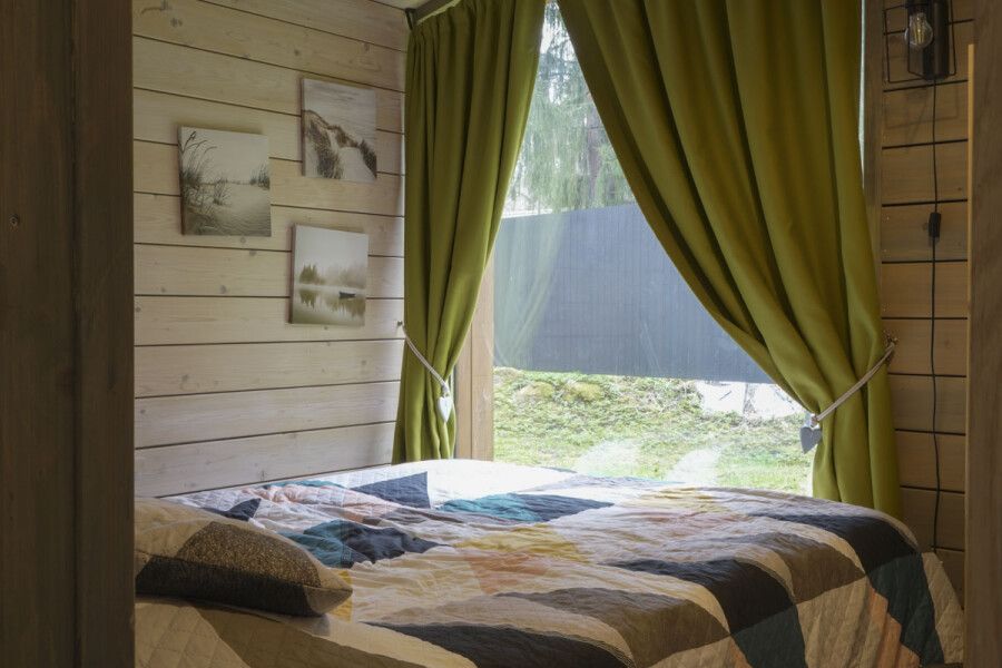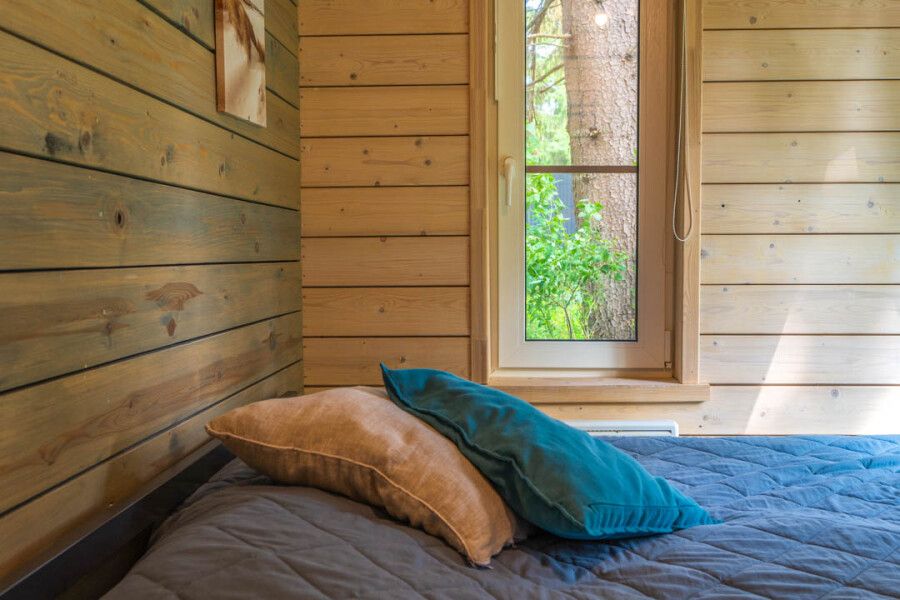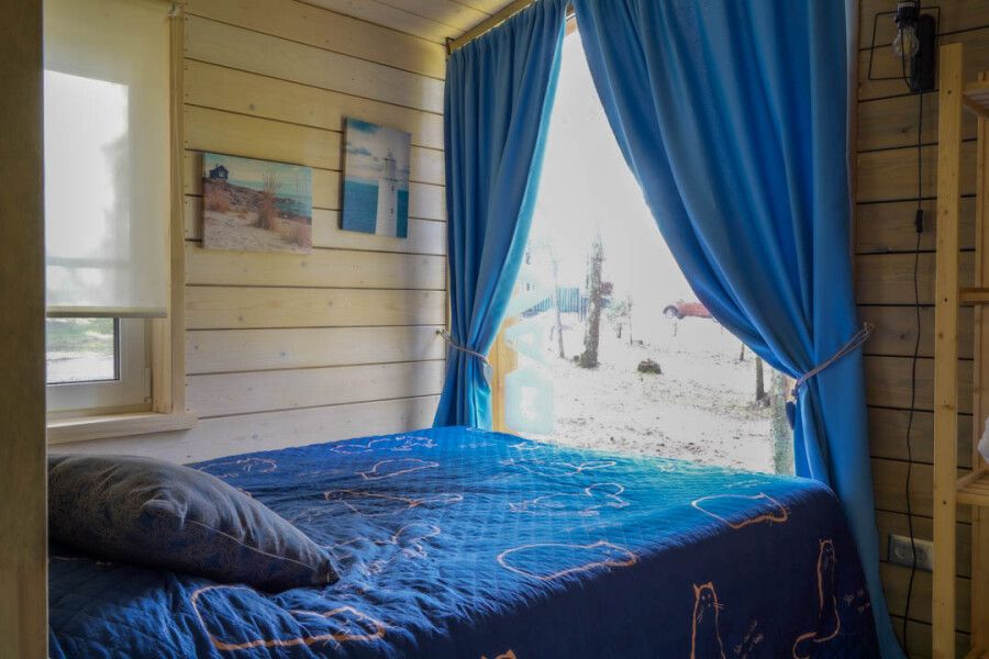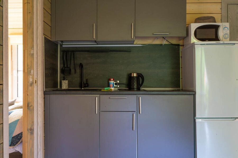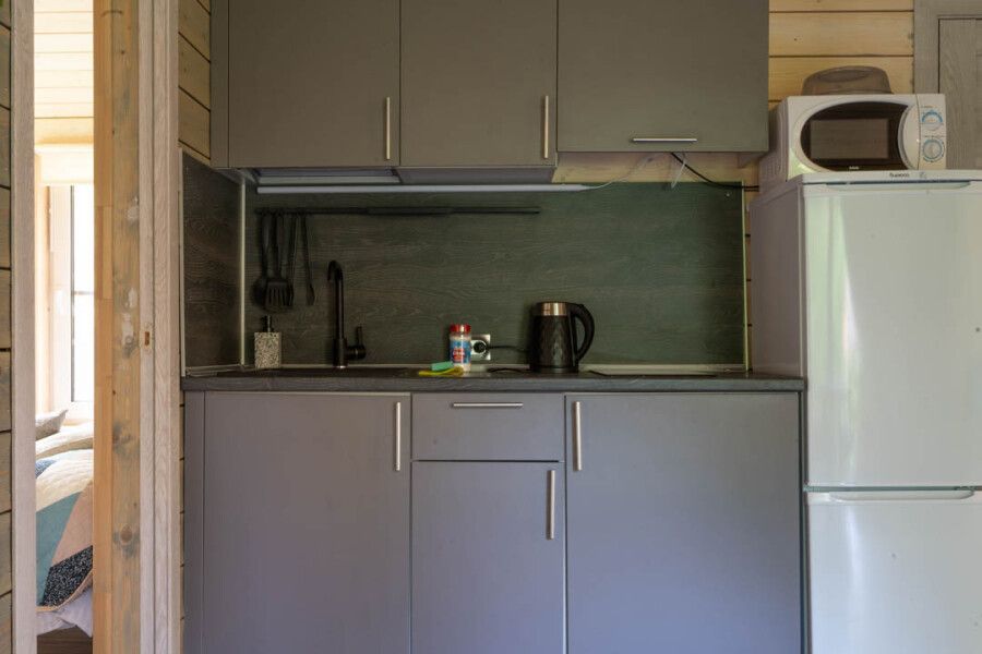 Каждый дом имеет общую площадь 60 м² и включает просторную кухню-гостиную с дровяной печью и раскладным двухместным диваном. Кухонная зона полностью оснащена для приготовления пищи: варочная панель, микроволновая печь, двухкамерный холодильник и посуда на шесть человек. Снаружи установлен индивидуальный мангал.