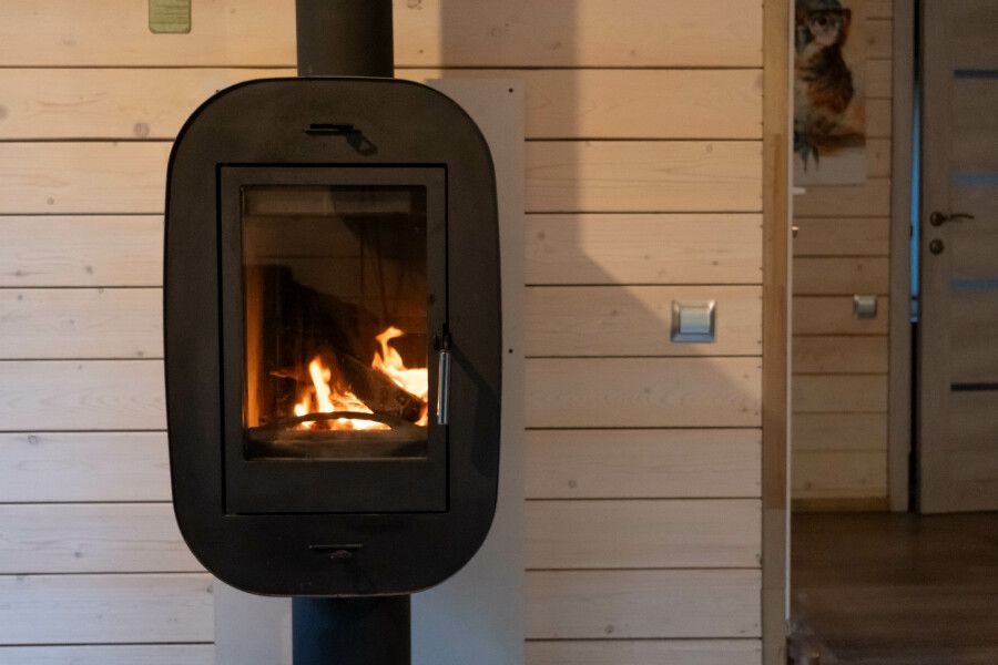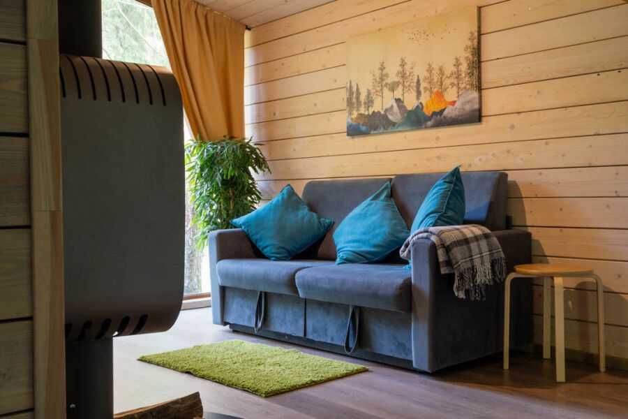 Просторная кухня-гостиная с дровяной печью и двухместным диваном.