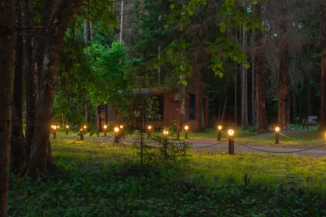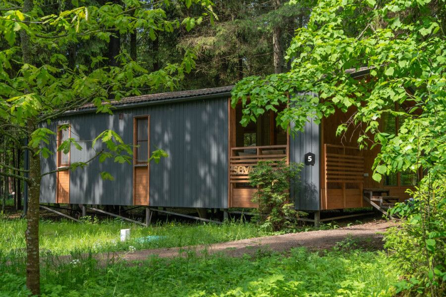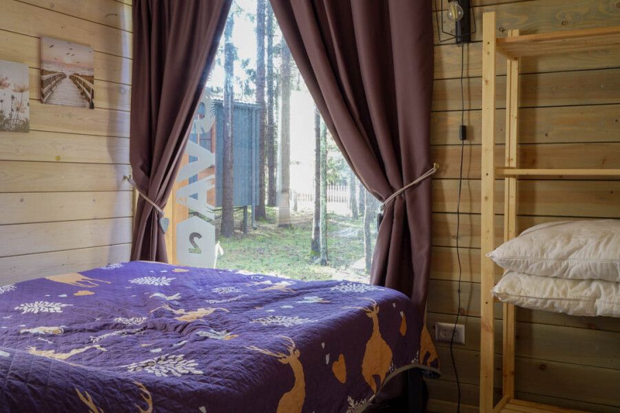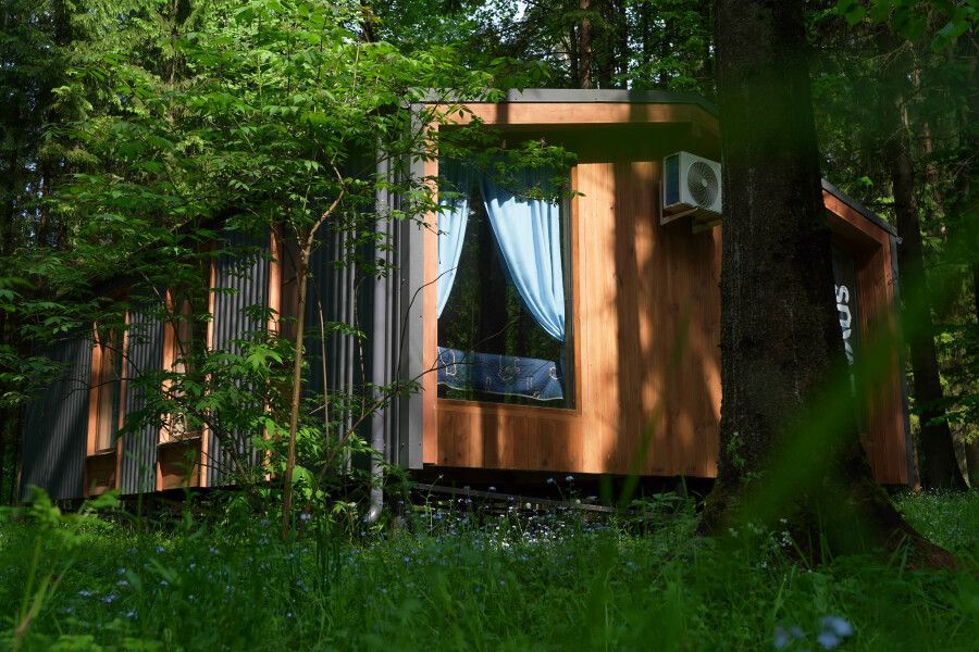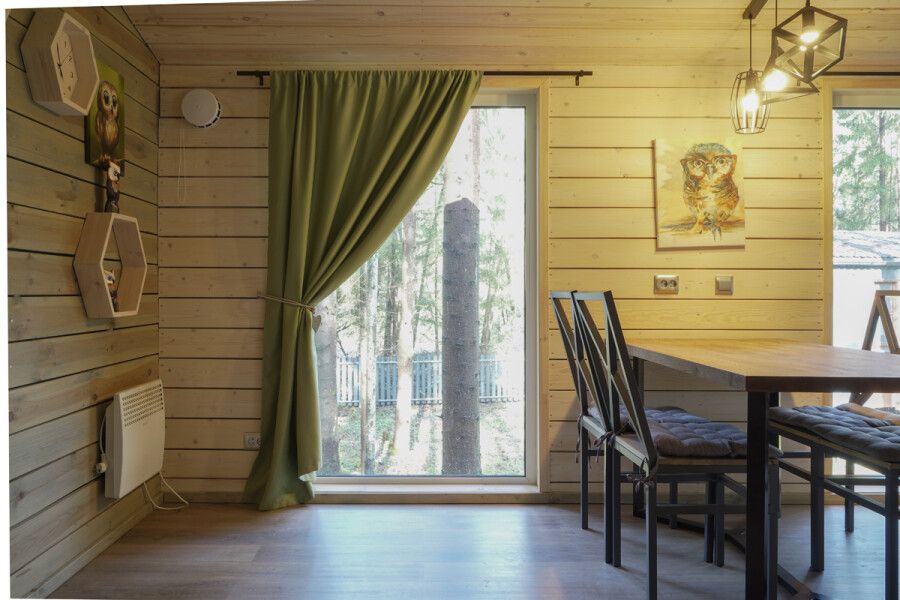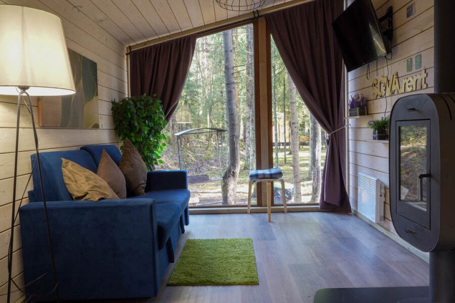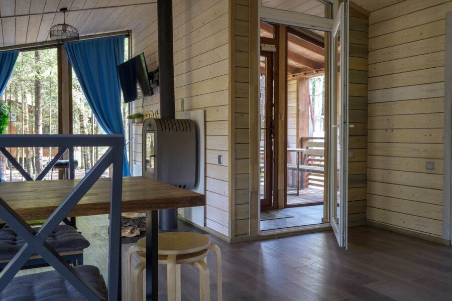 Также вашем распоряжении будут теплый санузел с горячей водой, комната отдыха, освещенная терраса с видом на лес и мангал.