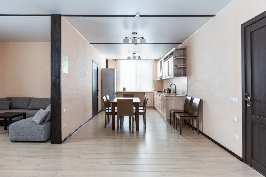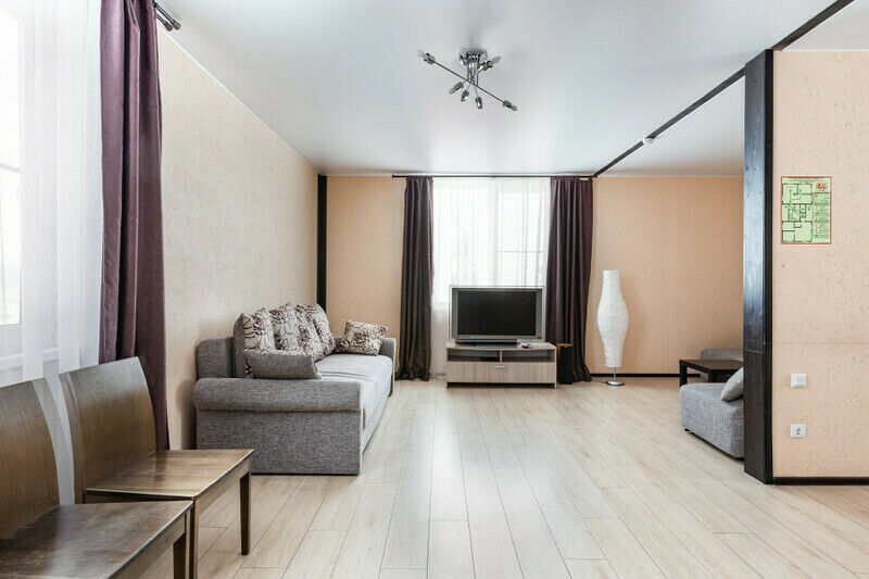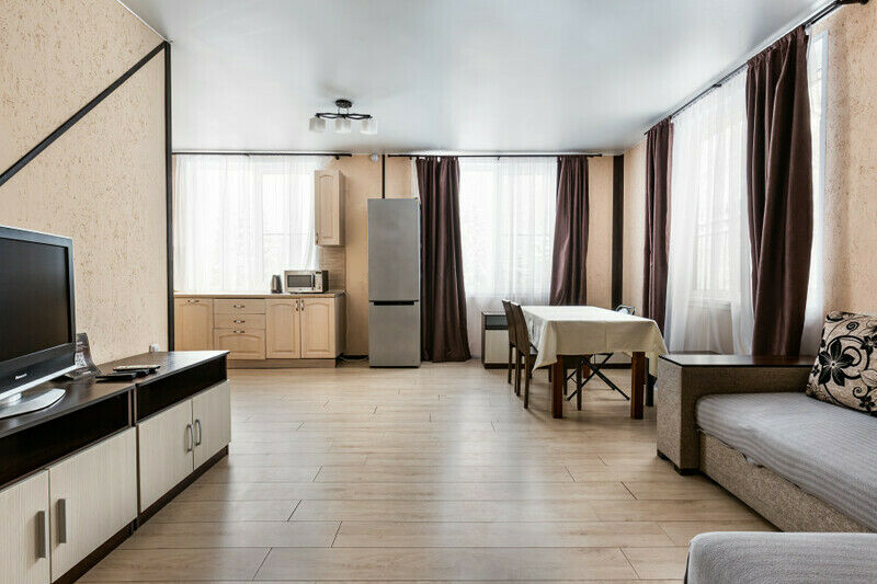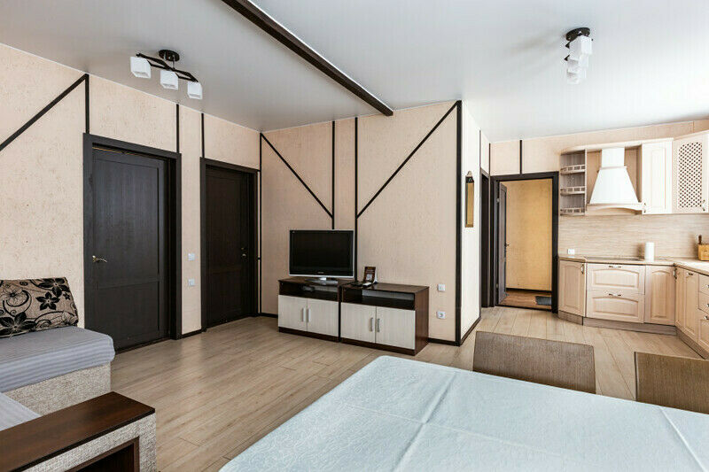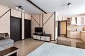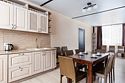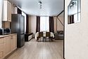 Оборудованная кухня с плитой и посудомоечной машиной, переходящая в гостиную комнату с 2-спальным диваном; две спальные комнаты для двухместного размещения, сан.узел с душем
