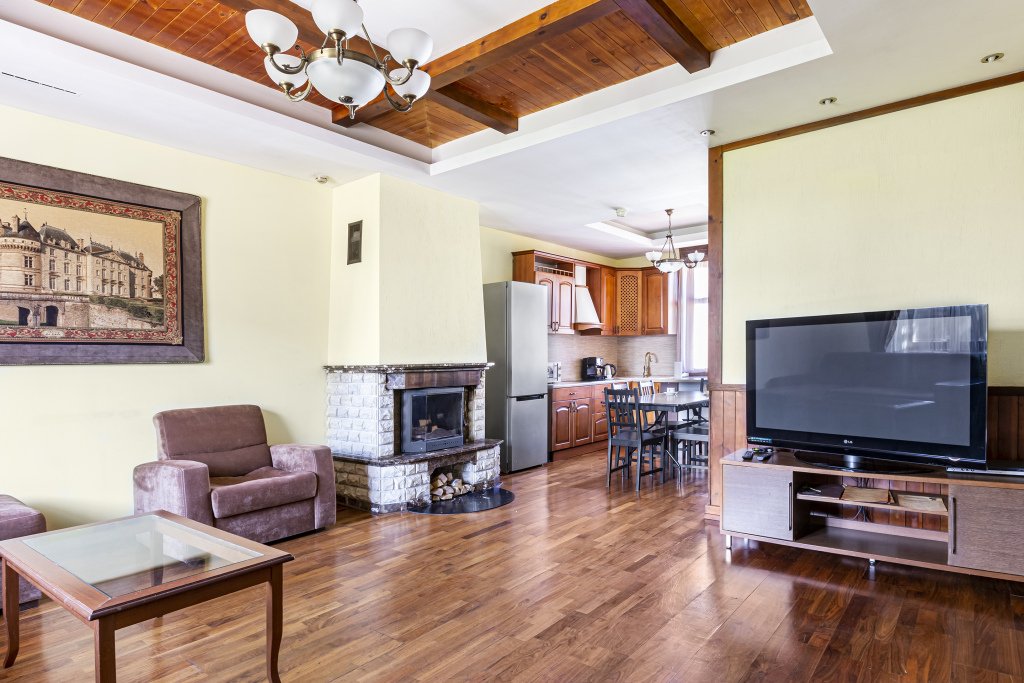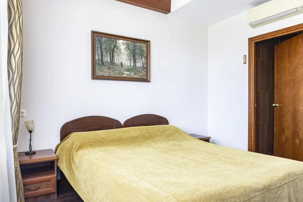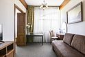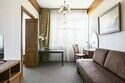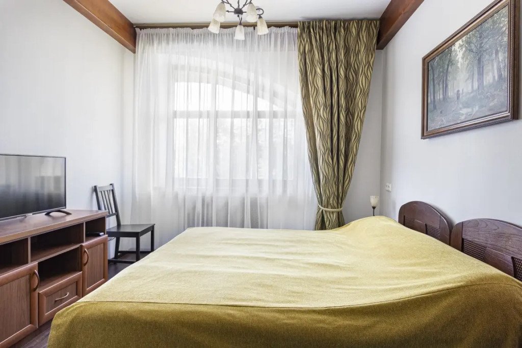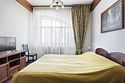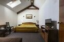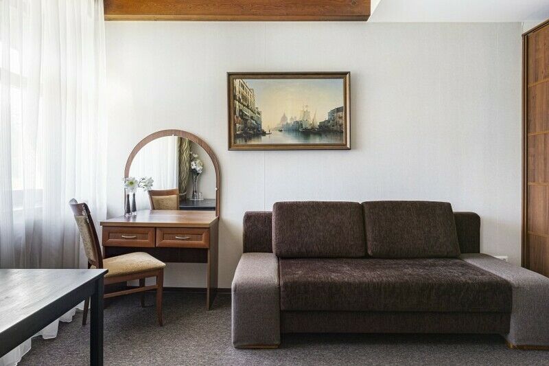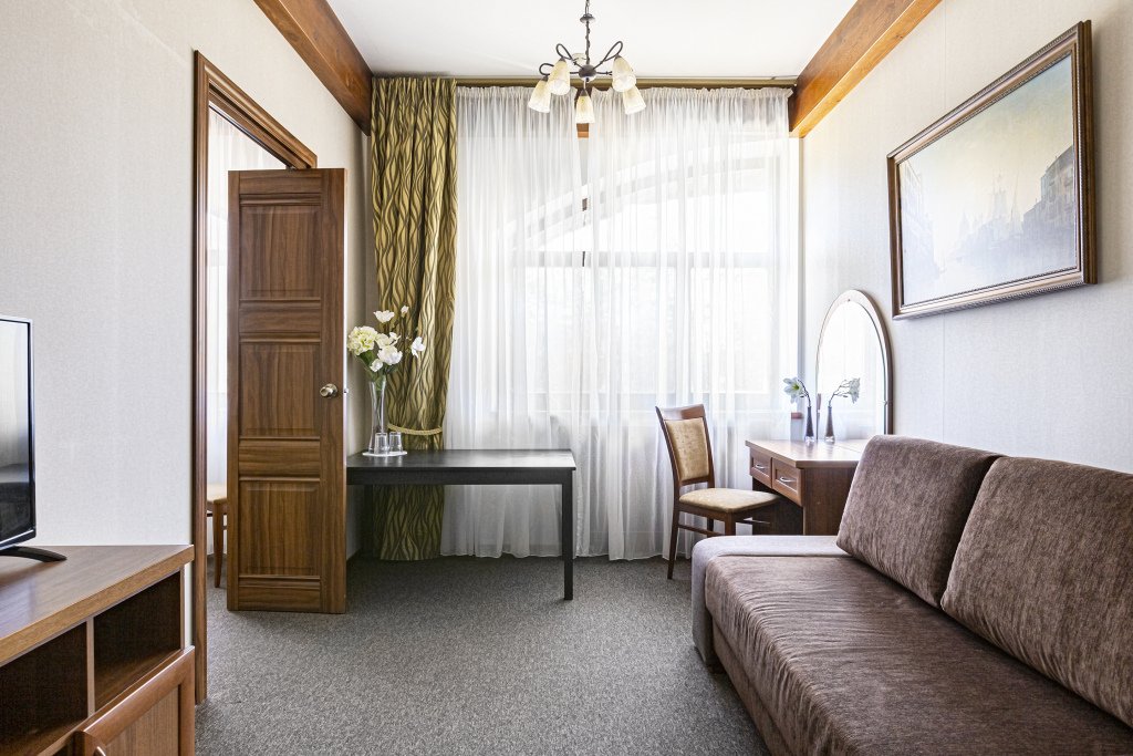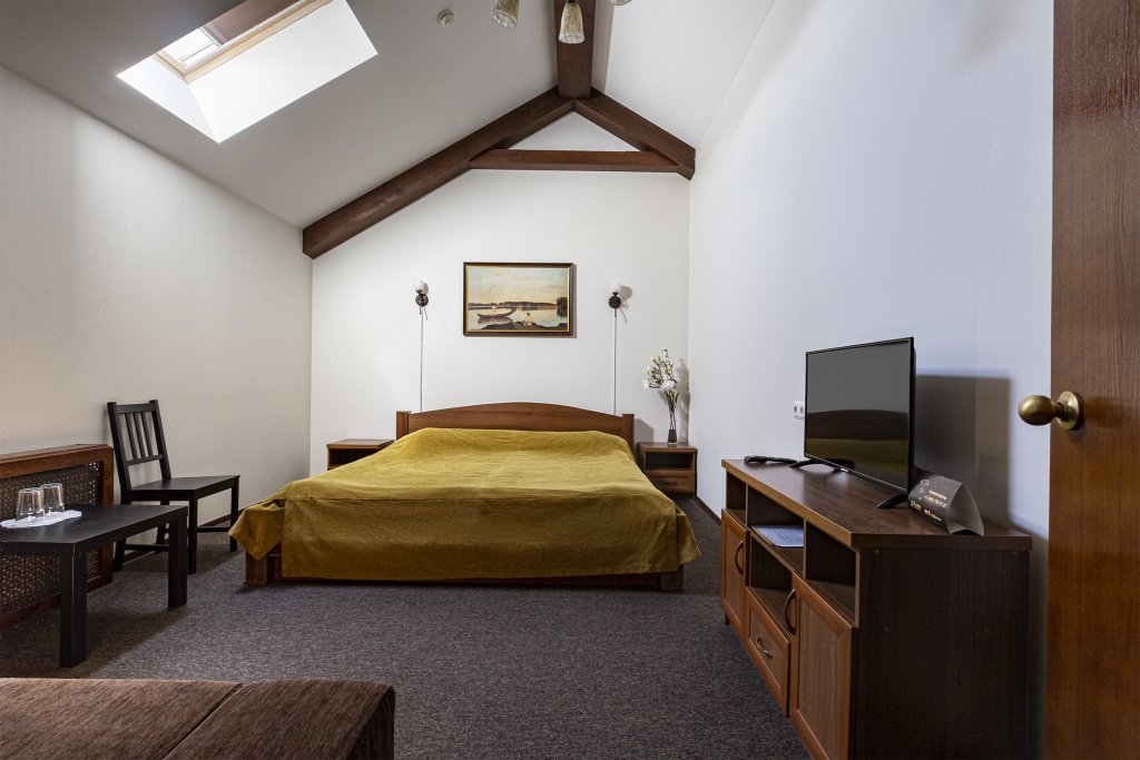 Люксы обставлены современной и удобной мебелью, располагающей к полному расслаблению и отдыху. Помимо двуспальной кровати в Люксе расположен большой двуспальный диван.