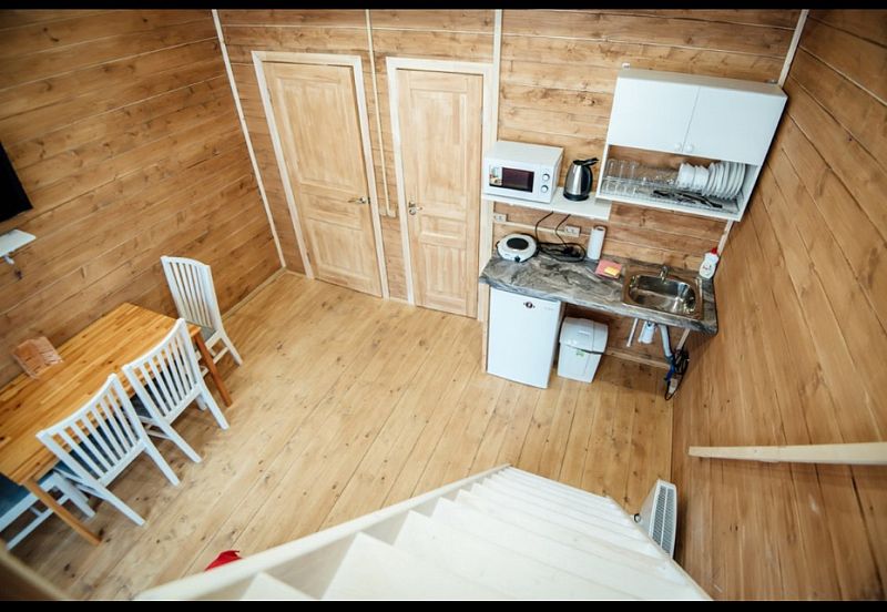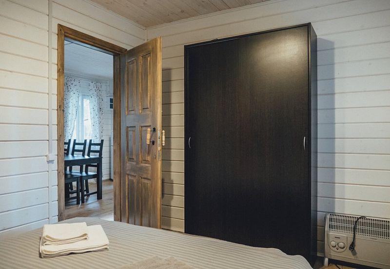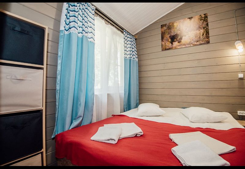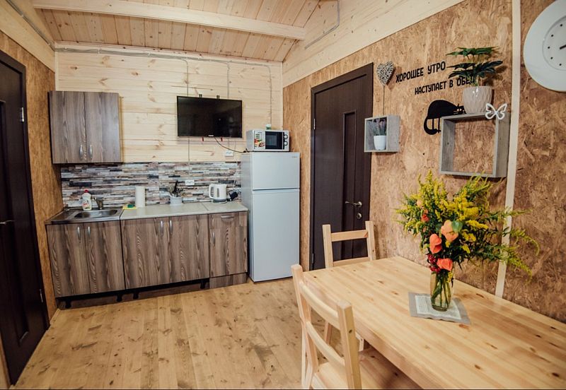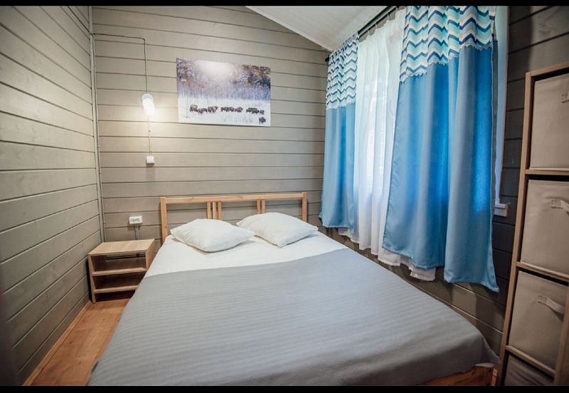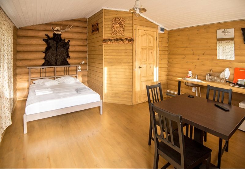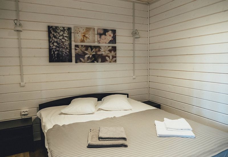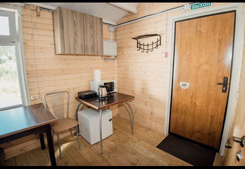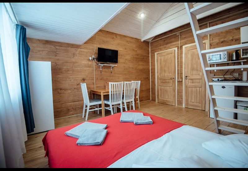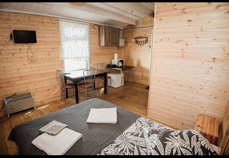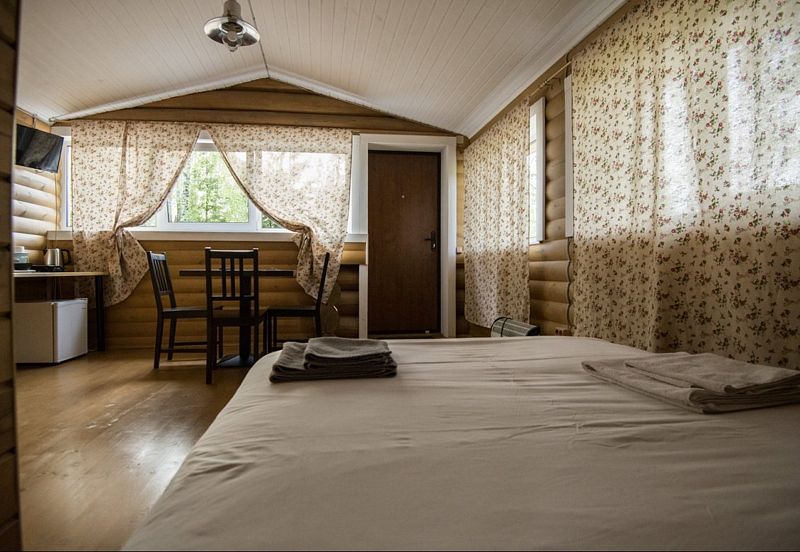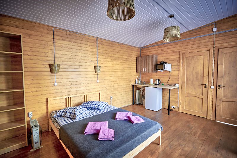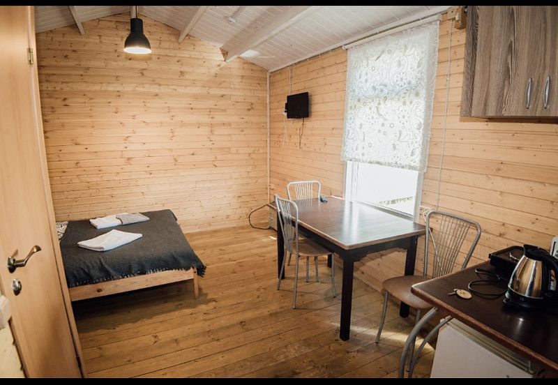 В коттедже предусмотрено все необходимое для комфортного проживания. Обособленные обеденная и спальная зоны с двуспальной кроватью позволят с комфортом разместиться. Гости также могут воспользоваться оборудованным кухонным блоком, в котором есть одноконфорочная электрическая плитка, однокамерный холодильник, разнообразная кухонная и столовая посуда, обеденный стол, электрочайник и микроволновая печь. Душевая комната и санузел совмещены.