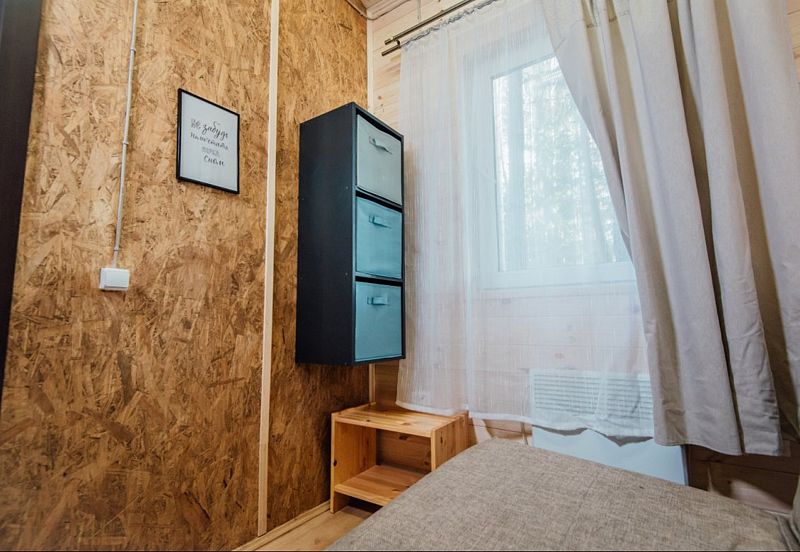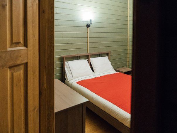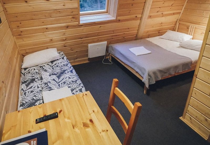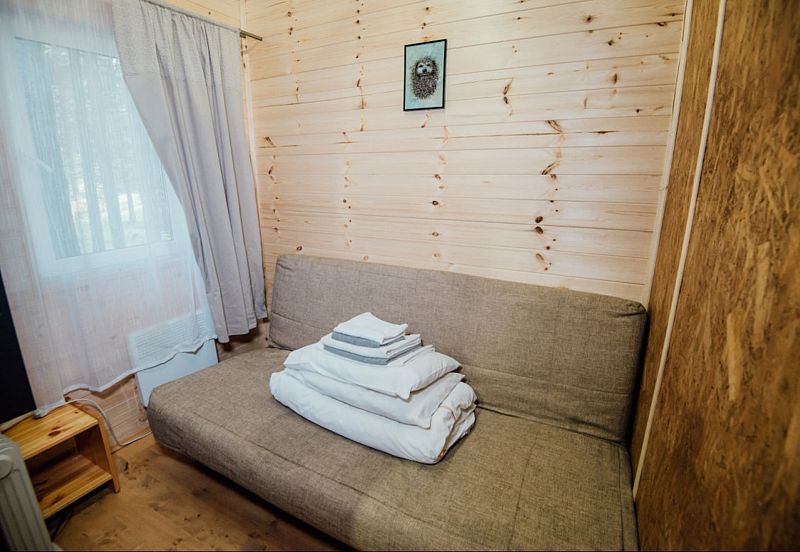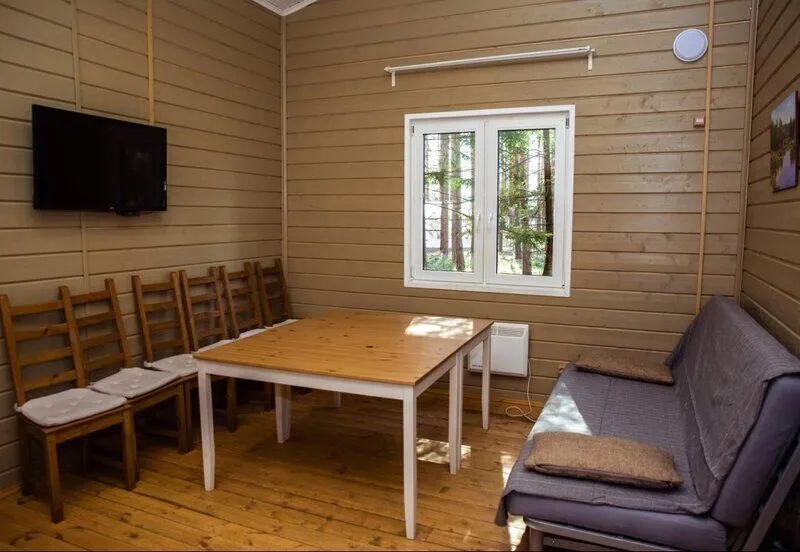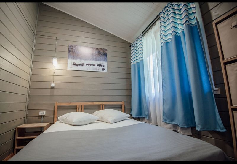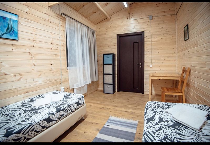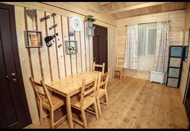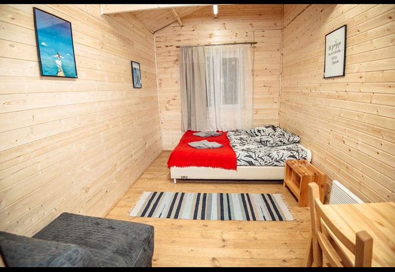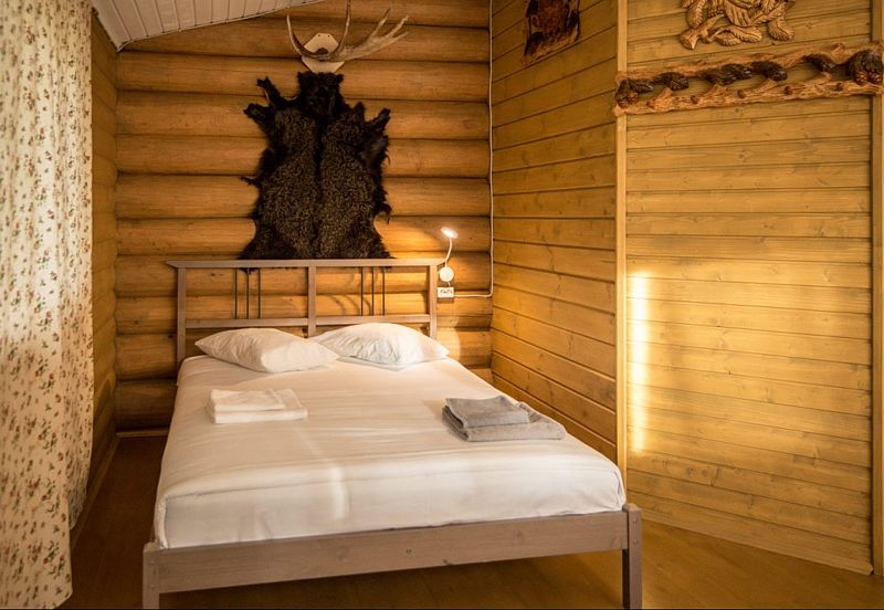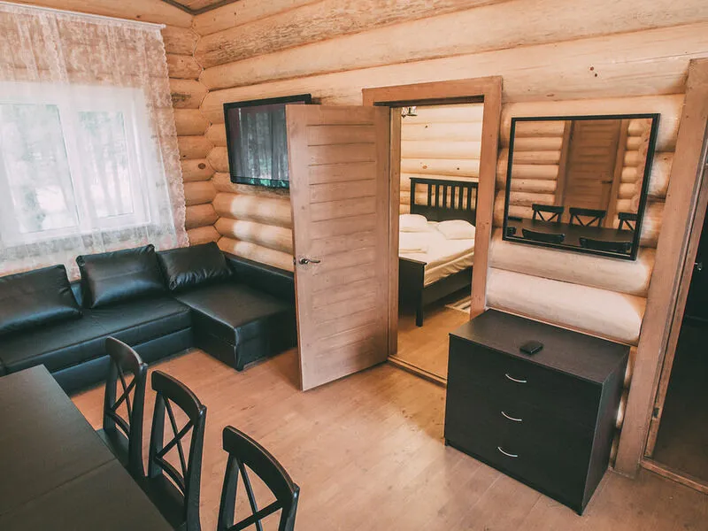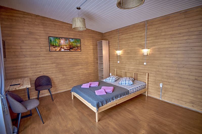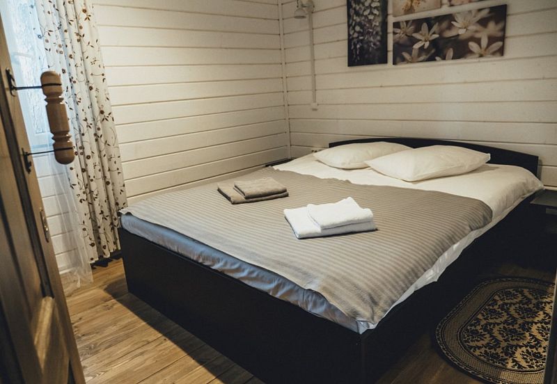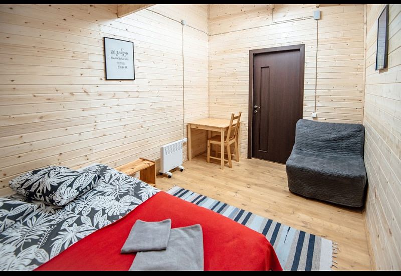 В коттедже предусмотрено все необходимое для комфортного проживания. Обособленные обеденная и спальная зоны с двуспальной кроватью позволят с комфортом разместиться. Гости также могут воспользоваться оборудованным кухонным блоком, в котором есть одноконфорочная электрическая плитка, однокамерный холодильник, разнообразная кухонная и столовая посуда, обеденный стол, электрочайник и микроволновая печь. Душевая комната и санузел совмещены.