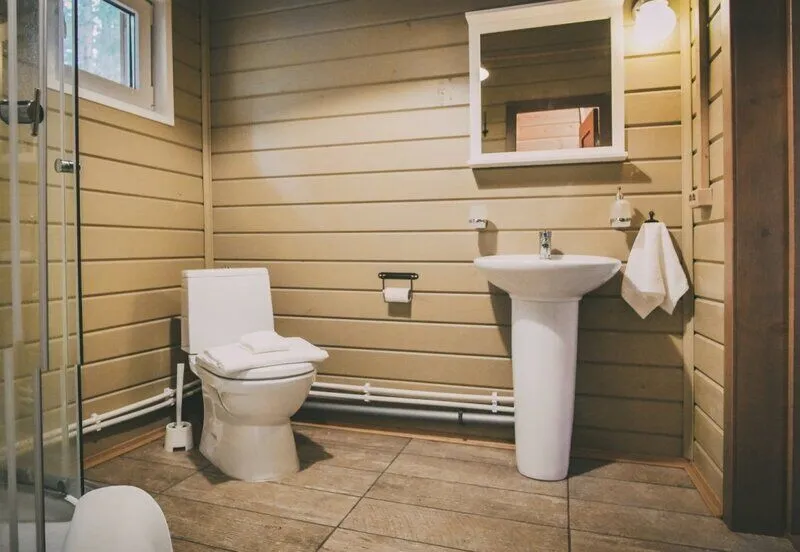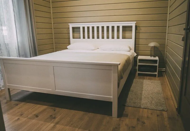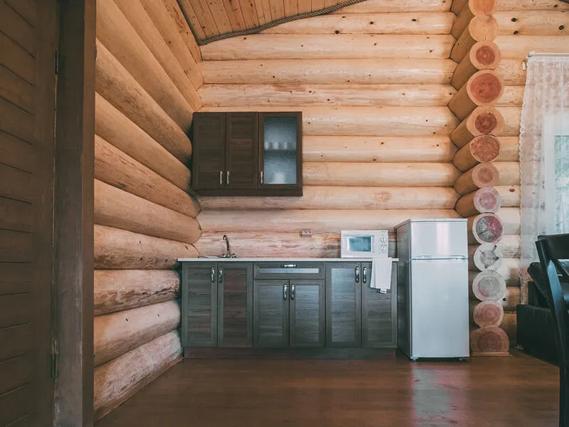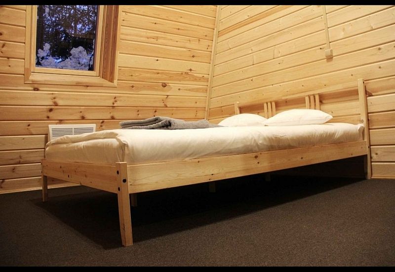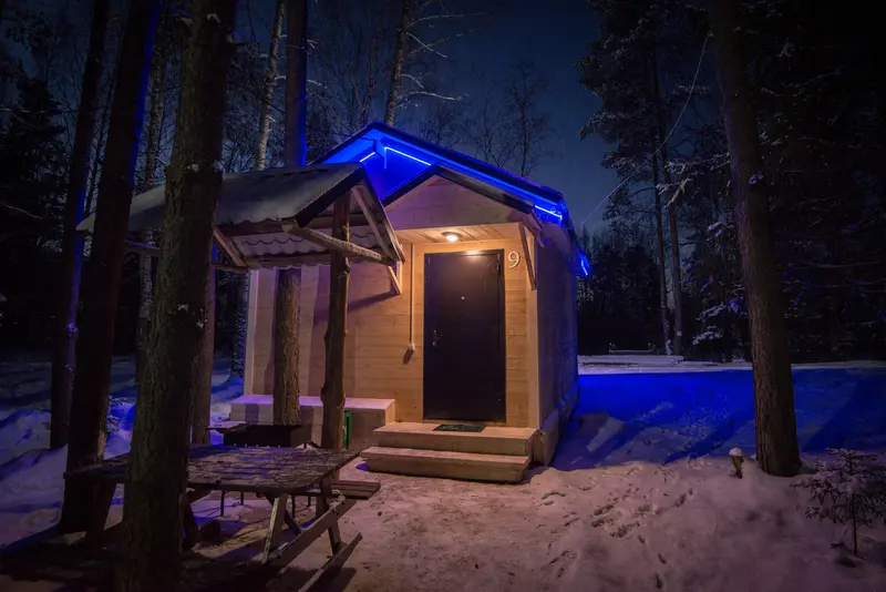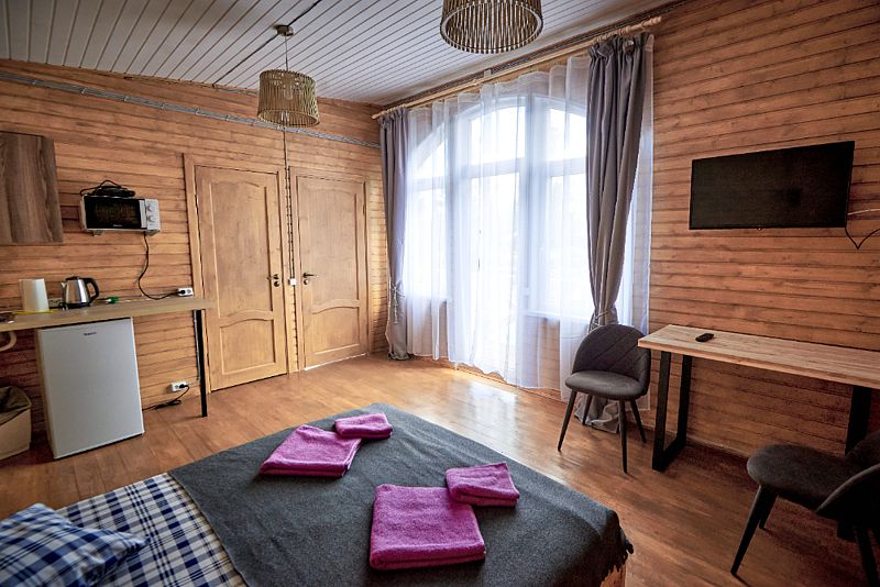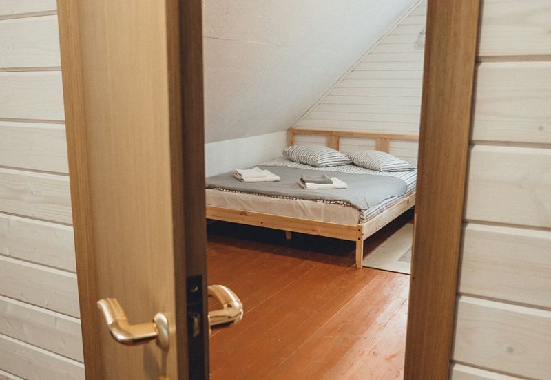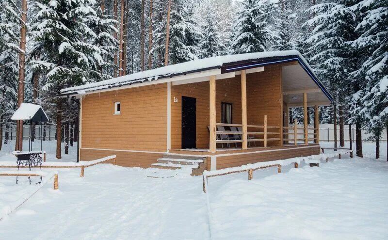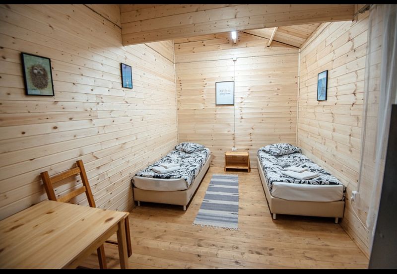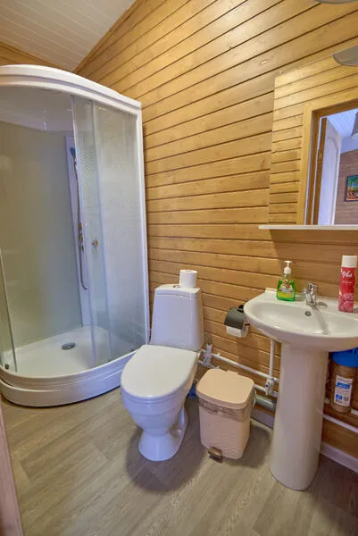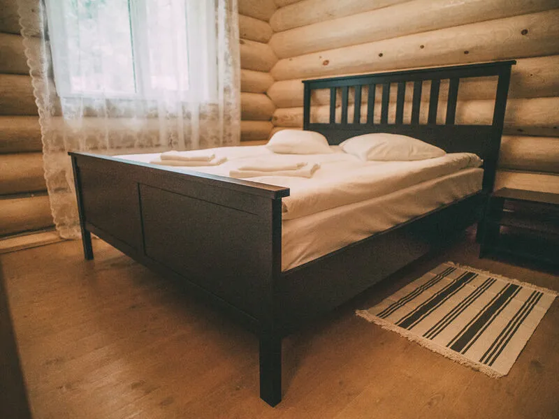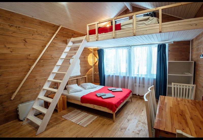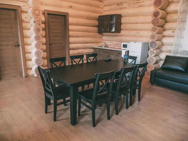 В коттедже предусмотрено все необходимое для комфортного проживания. Обособленные обеденная и спальная зоны с двуспальной кроватью позволят с комфортом разместиться. Гости также могут воспользоваться оборудованным кухонным блоком, в котором есть одноконфорочная электрическая плитка, однокамерный холодильник, разнообразная кухонная и столовая посуда, обеденный стол, электрочайник и микроволновая печь. Душевая комната и санузел совмещены.
