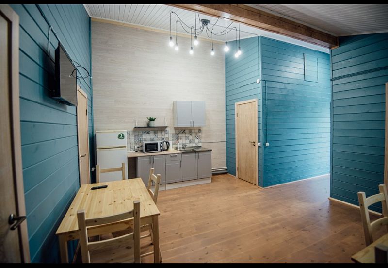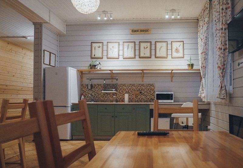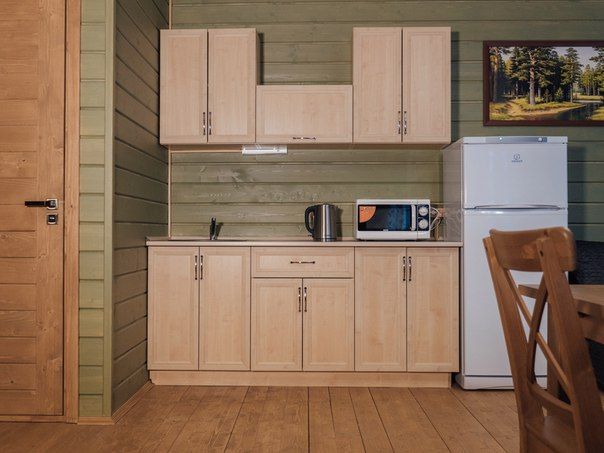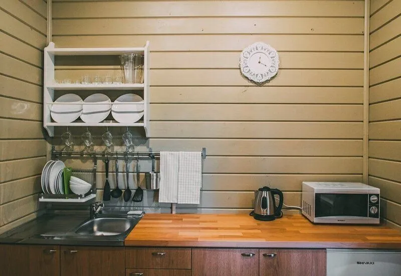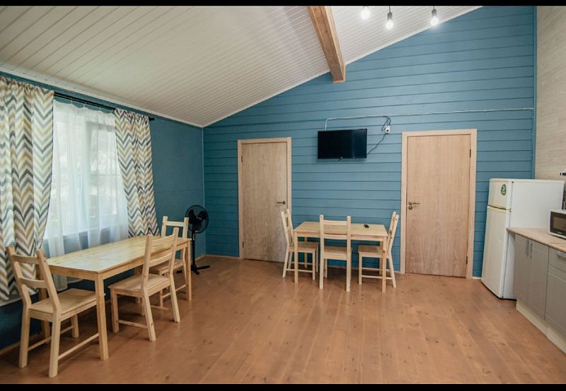 - Оборудованная кухня (электрическая плитка, холодильник 120 см, вся необходимая кухонная и столовая посуда (тарелки, чашки, вилки, ложки, ножи, стаканы, стопки, кастрюли, сковородки), обеденный стол, электрочайник, СВЧ-печь);
