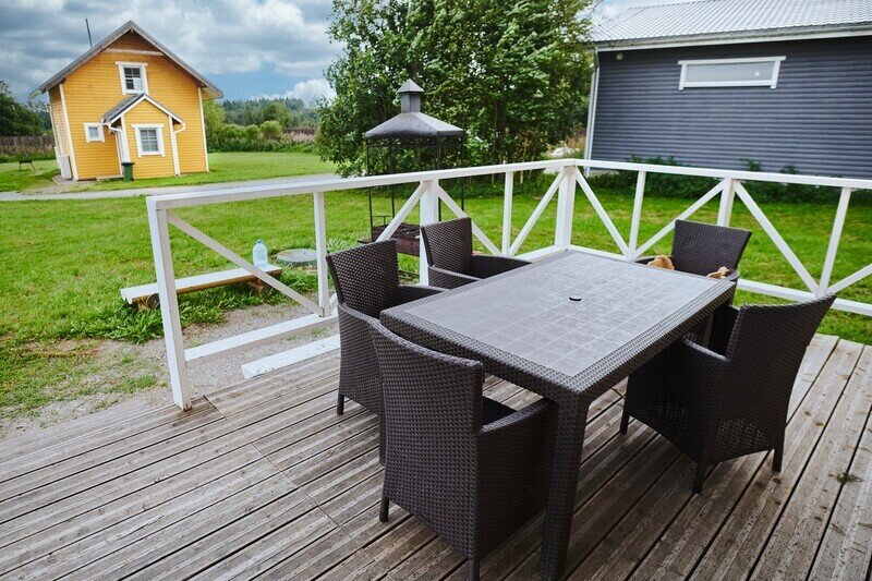 Коттедж со всеми удобствами и отоплением: 2 спальни (в каждой по 2 односпальные кровати) + гостиная с диваном-кроватью и кухня, туалет, душ, терраса, полностью оборудованная кухня (холодильник, плита, духовка, чайник, кофеварка, тостер, микроволновая печь, посудомоечная машина, все кухонные принадлежности), стиральная машина, телевизор с плоским экраном, постельное белье, полотенца, тапочки, утюг, фен, сушилка для белья, мебель на улице, все необходимые принадлежности для барбекю.